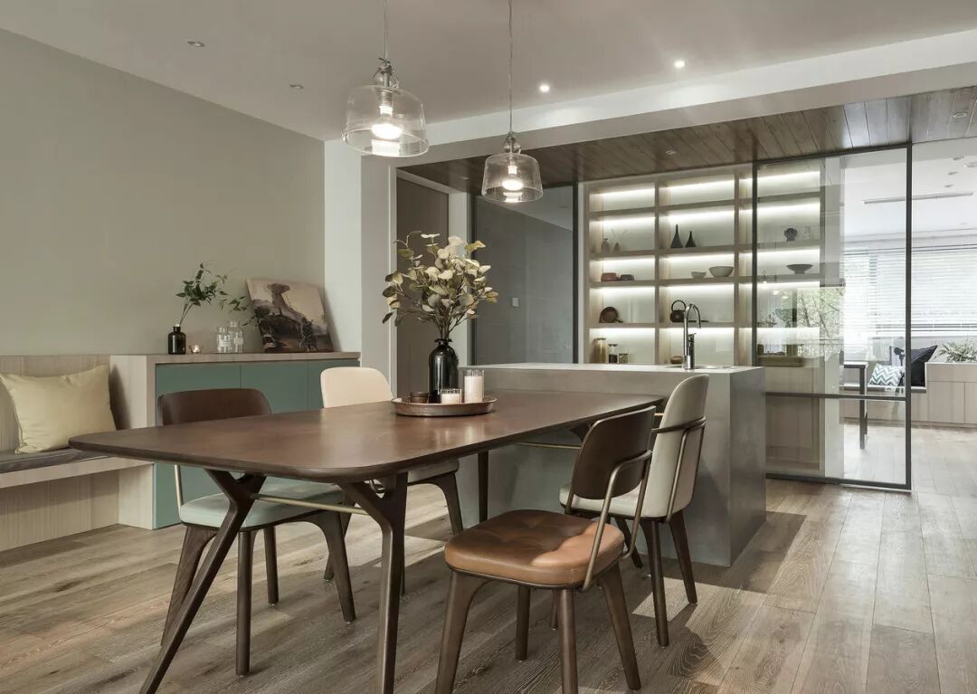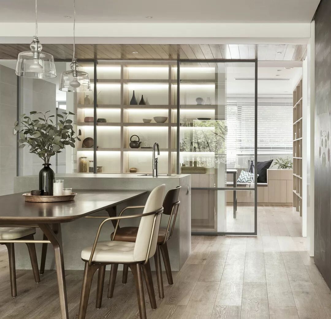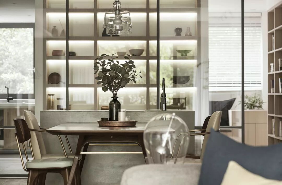 ▲餐厅空间也相对宽松,与休闲室之间隔着一个展示架+玻璃推门,展示架上摆着各式装饰品,让空间充满了艺术的档次感。
