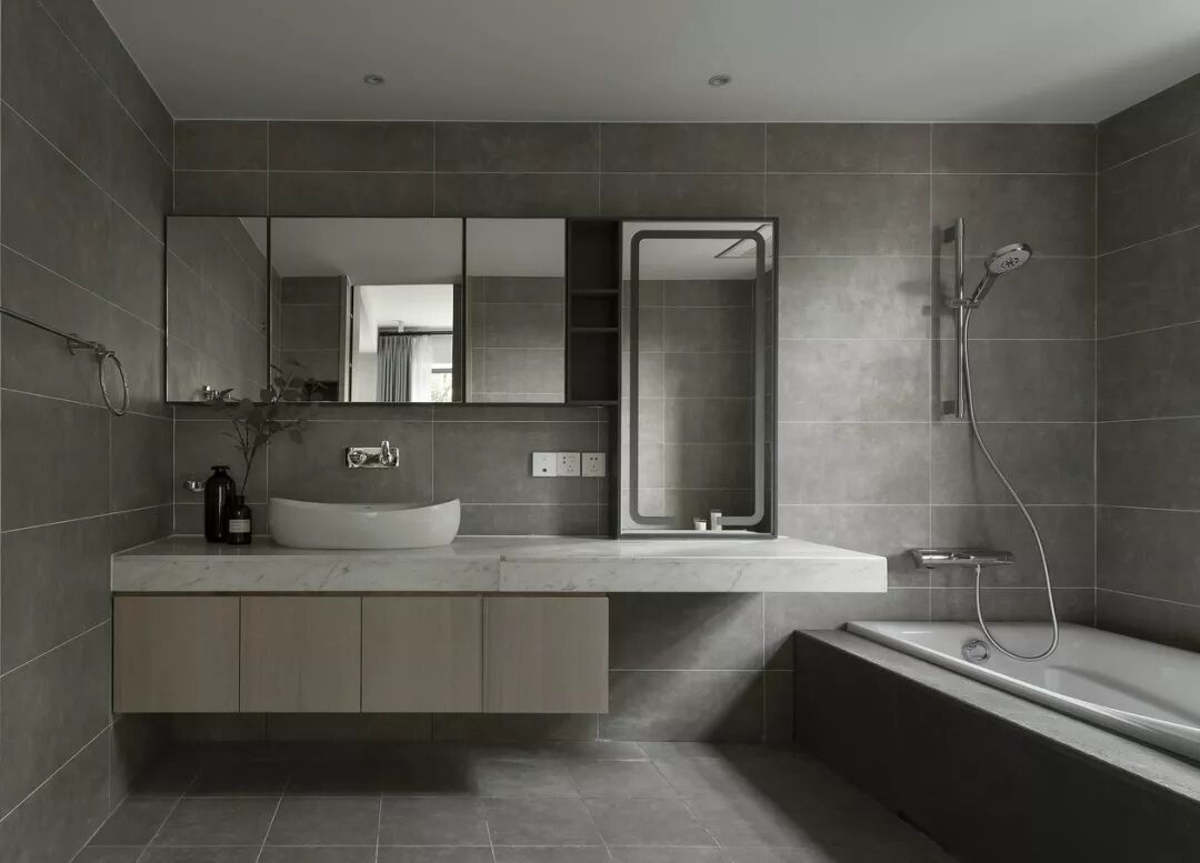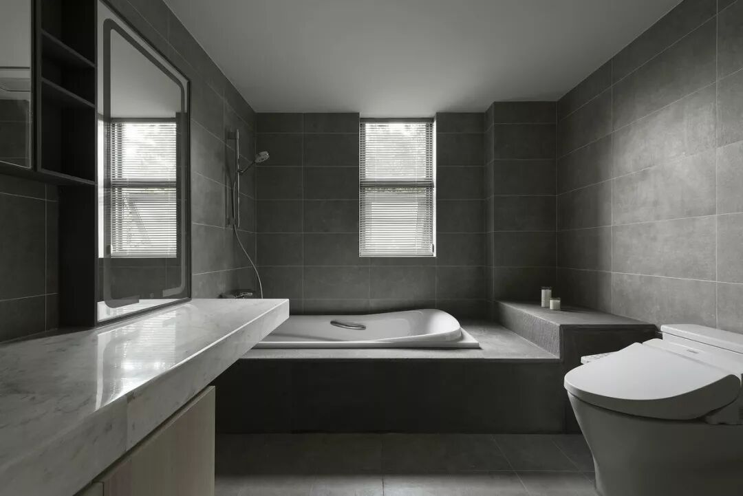 ▲卫生间的洗手盆延伸到浴缸旁边,腾出了一个梳妆台的位置,在灰色调的空间里营造出充满简约大方的空间感。