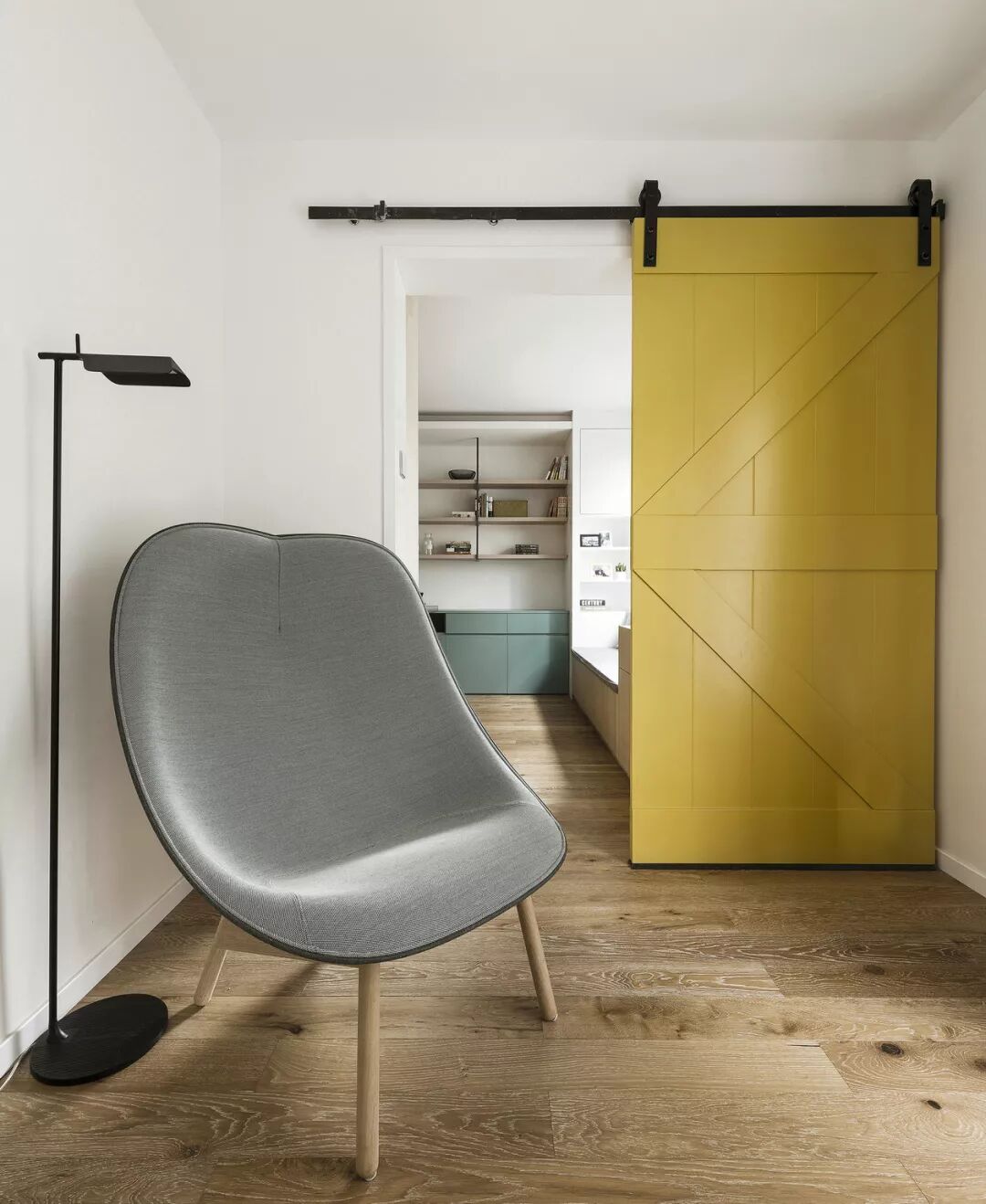 ▲书房空间以黄色谷仓门搭配,门外还有一张休闲椅与落地灯,坐在这里可以放松或小憩。