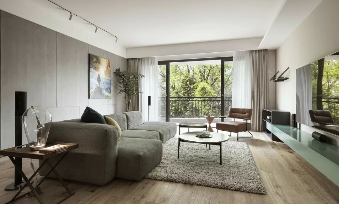 ▲客厅沙发墙是木皮张贴的,搭配上暖灰色布艺沙发,顶上一排的导轨灯,沙发墙右侧挂一幅画+一盆绿植,不对称的空间,也是显得现代大方舒适。