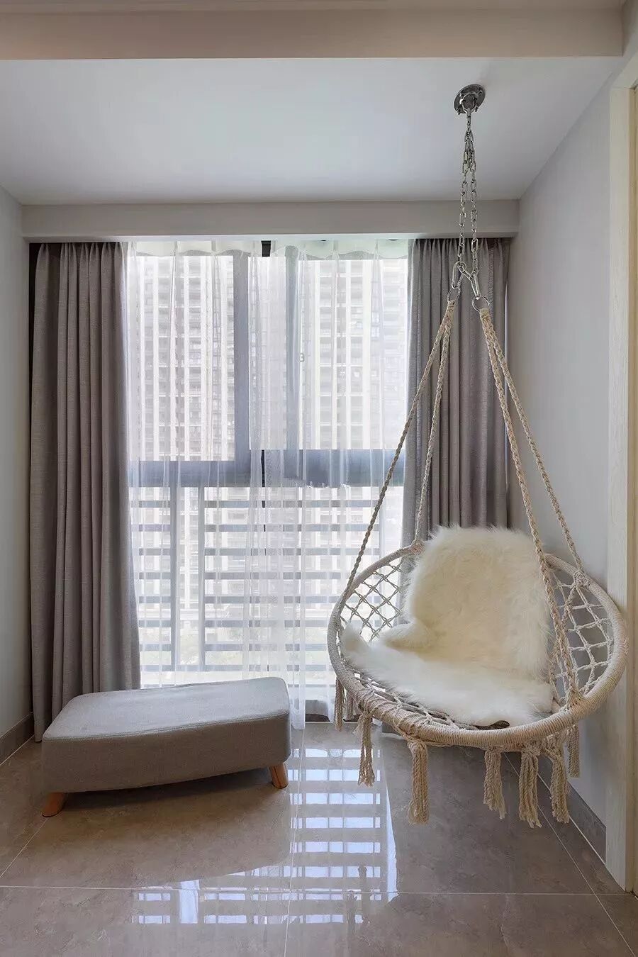 如果担心纯粹的玻璃落地窗不安全的话,可以加装一个铁艺护栏,这样既保持空间的通透感,又能显得有安全感。