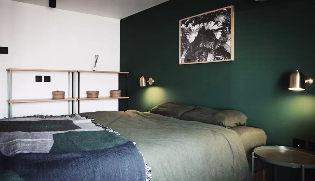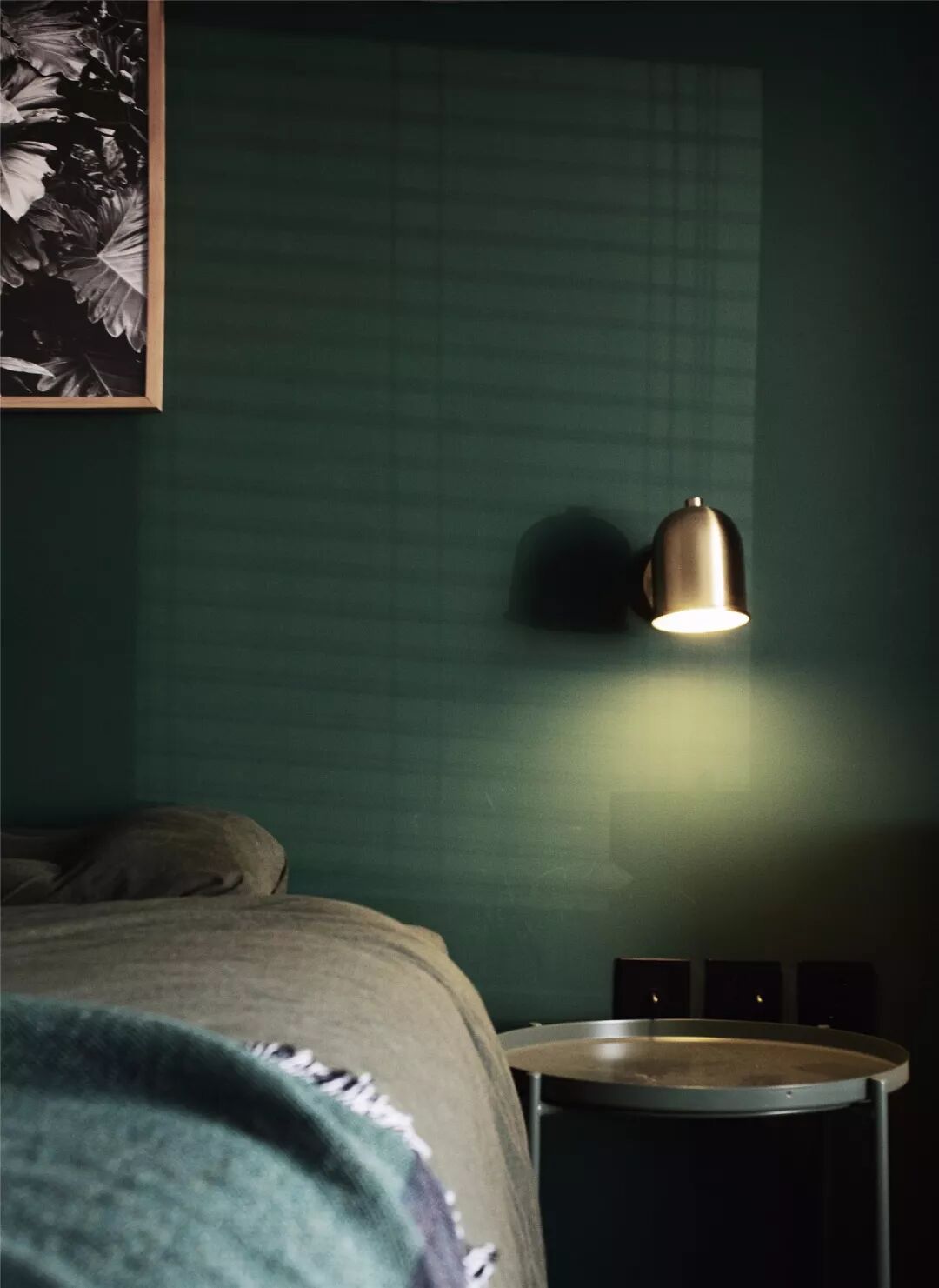 ▲绿色床头墙搭配铜质壁灯,整体素色的软装布置,带来的是庄重优雅的稳重感。