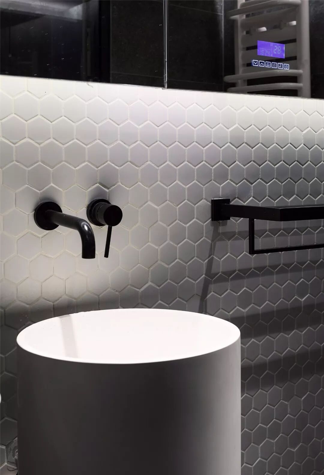 ▲整个卫生间都是深灰色调的,天花与镜柜做了一圈藏光,洗手盆一侧的墙面是六边砖的浅灰小砖,搭配出来的空间显得简约时尚而又有层次感。