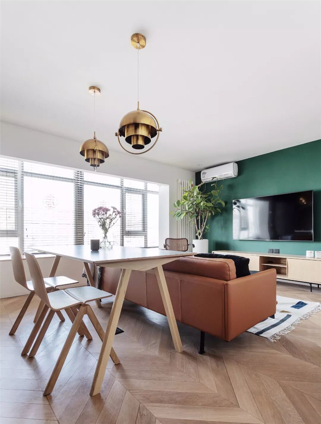 ▲沙发后方的是餐桌区域,一张木质餐桌搭配两张餐椅,顶上两盏黄铜质感的吊灯,带来简洁大方的华丽用餐气息。