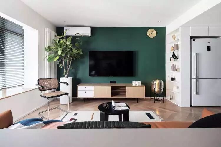 ▲电视墙以深绿色的墙面,搭配木质电视柜显得庄重而闲适,电视柜两旁的角落分别布置大绿植与铜质摆饰,壁挂空调也挂在电视墙左上角,右上角是一个铜质挂钟,整体端庄的氛围,优雅华丽。
