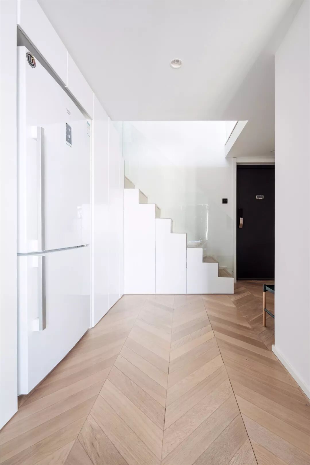 ▲玄关旁边是通往二层的楼梯,楼梯下与侧边都是丰富的收纳空间,整体白色的柜体,冰箱嵌入其中,整洁而大方舒适。