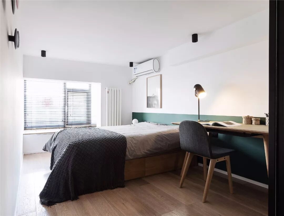▲次卧床头的墙脚绿色,白色墙身的空调下方挂一幅灰色简约画,窗户还有个情调的飘窗台,带来文静的舒适空间。