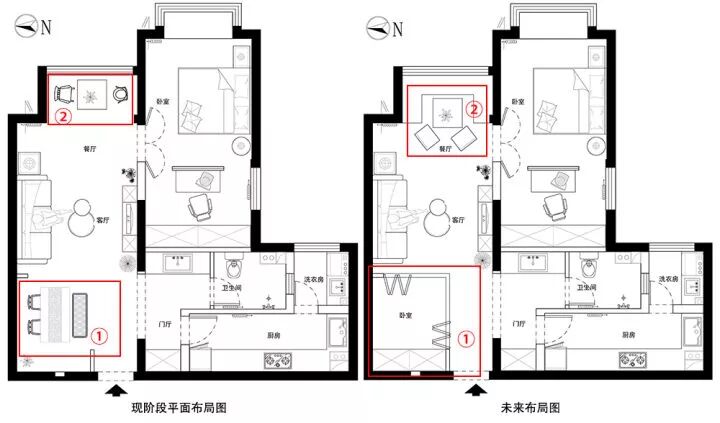 ②原本计划将餐厅规划在阳台,由于①区域不做卧室改做餐厅,就将阳台设计成了休闲区。