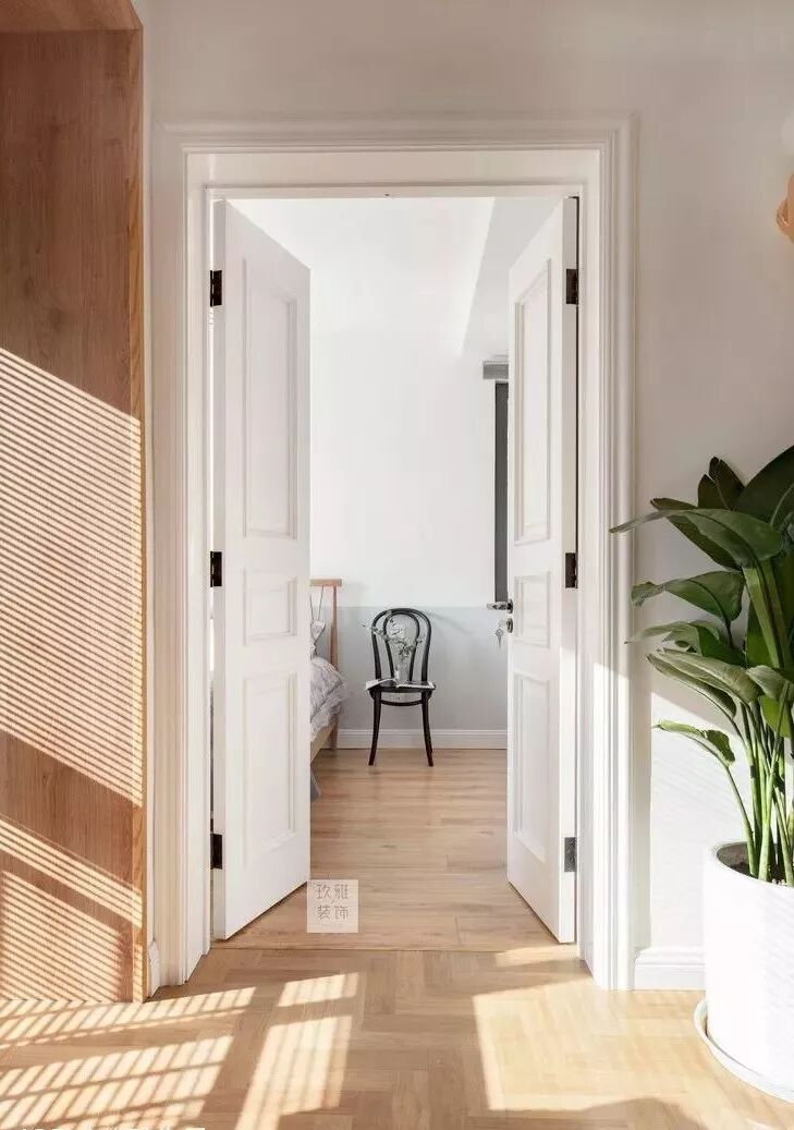 ▲卧室门做成了双开门,如果是单开门,门太长,开合会打到床和玻璃隔断,双开门就避免了这种尴尬的情况发生。