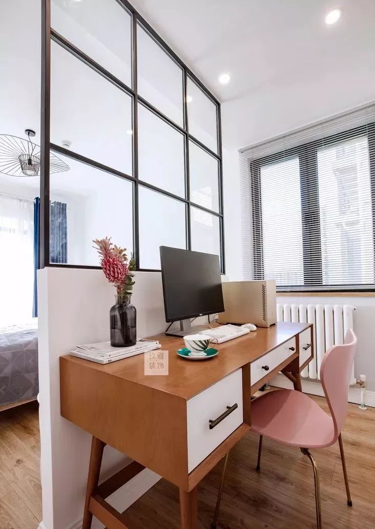 ▲业主需要一个放电脑的地方。主次卧打通后做了一个隔断,隔断后设计成简易工作区,椅子依旧是7号椅。