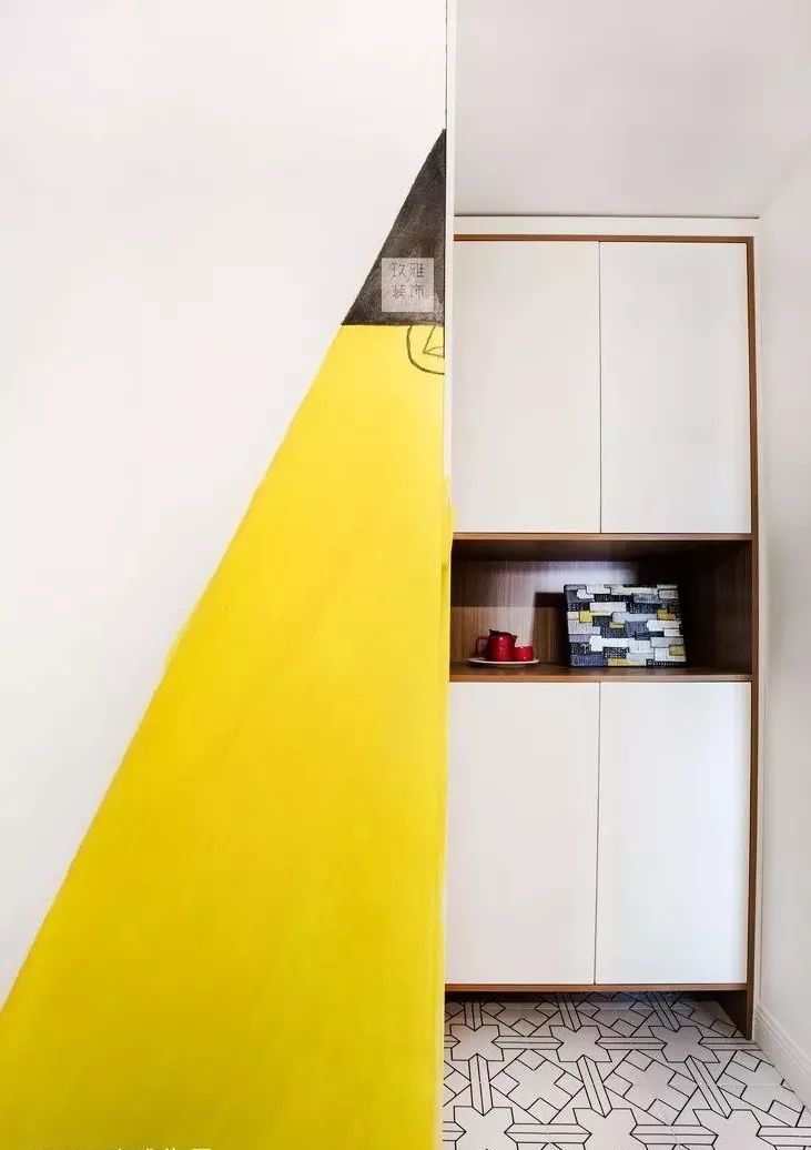 墙体改建后门厅部分出现了一个角,从风水角度来说,尖角不适合出现在家里(这没有什么大的影响,不在意风水可以忽略)。设计师亲手在尖角处画了一个灯,以此弱化角的存在感。
