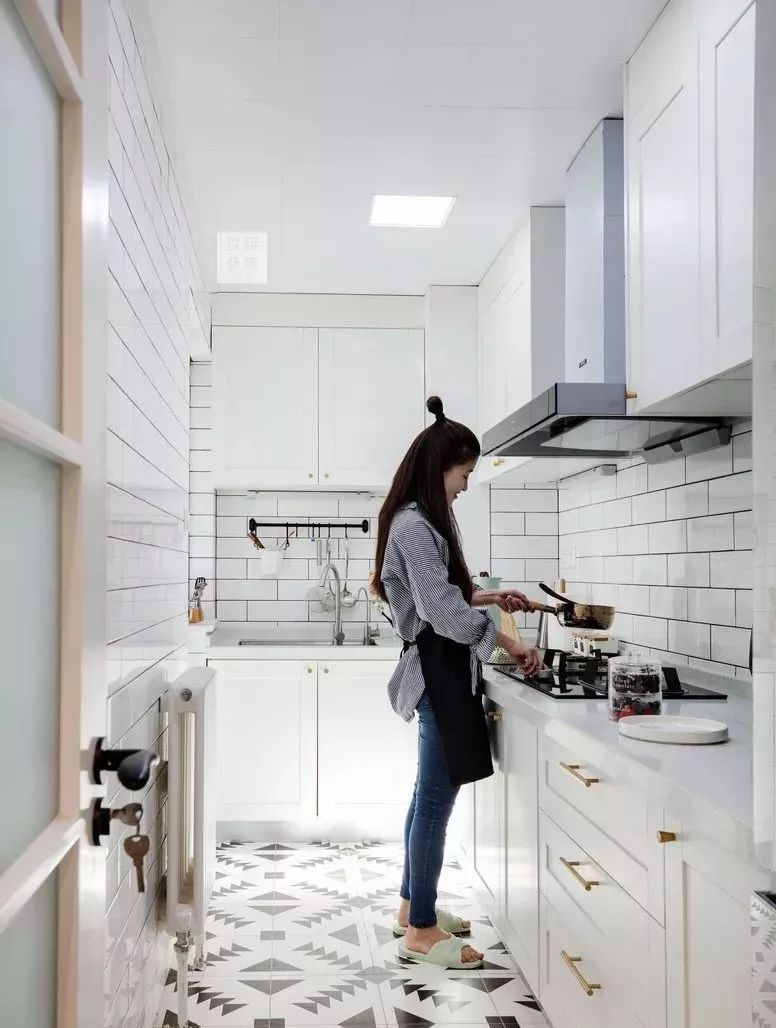 ▲厨房墙面全部贴的小白砖,厨房依照业主要求预留了比较多的插座,满足后期会不断增加电器所产生的需求。厨房的小阳台设计成洗衣房。