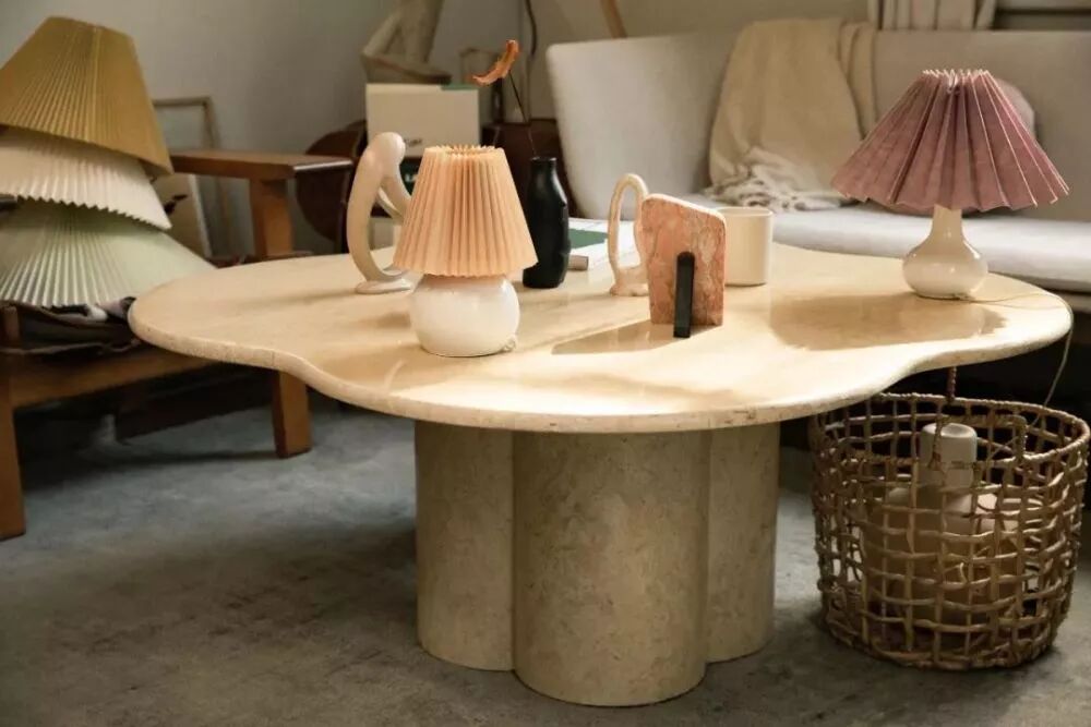 比如这个花瓣形茶几是60年代的意大利古董家具,它的色调是暖暖的黄色,大理石纹,跟家里的整体风格很契合。及它的弧度,它的花瓣形底座,都是现在很少见的款式。
