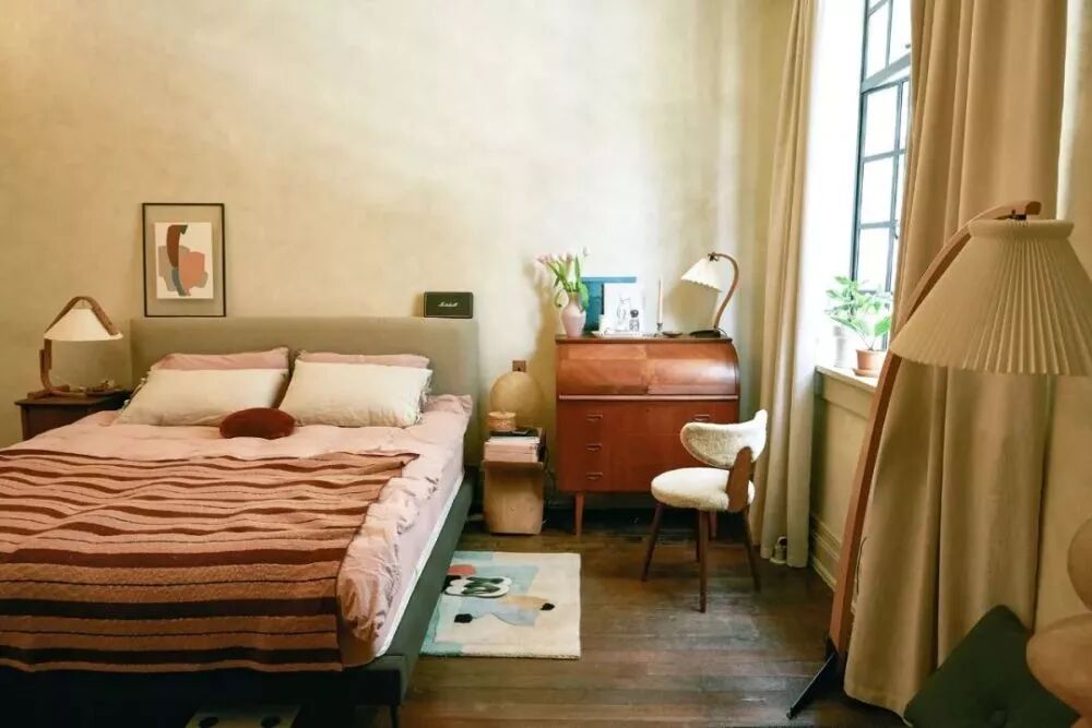 墙面涂料颜色和肌理的选择,极为重要。为了呼应老房里原有的“不值钱家当”,同时又让新的墙面没那么突兀,设计师专门挑了一款艺术涂料,使卧室墙面呈现整体泛着旧黄色调的斑驳感。