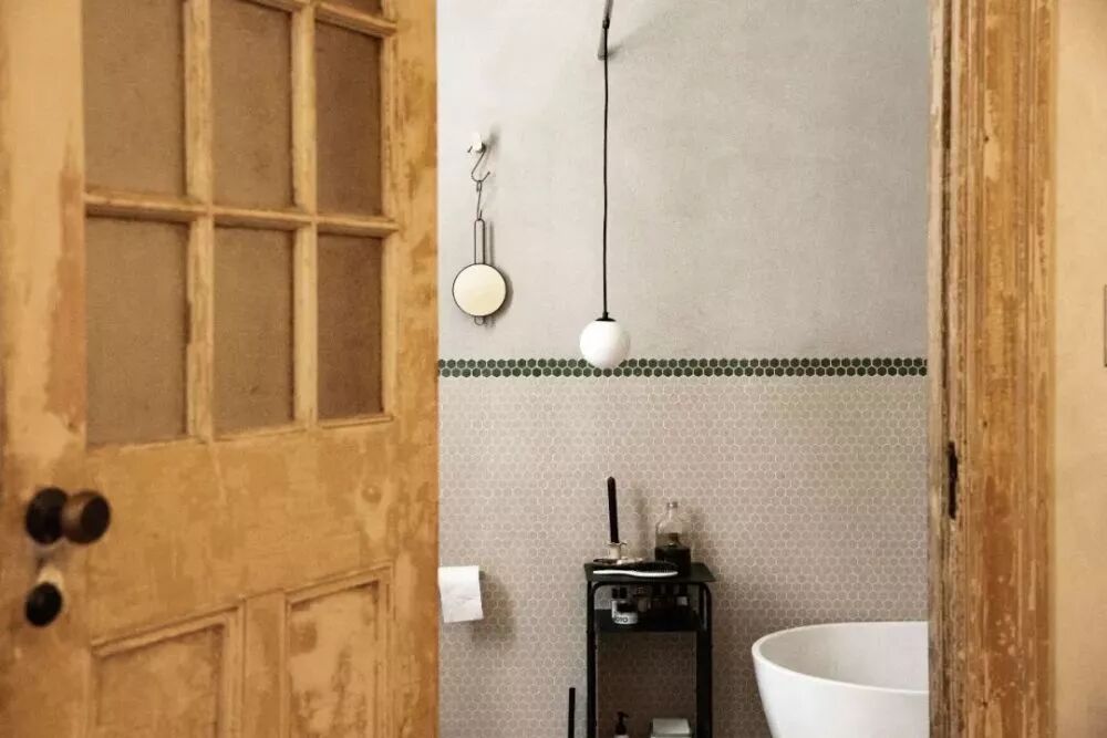 卫生间原本绿色斑驳的墙面状态特别像电影《水形物语》里面女主的房间。改造时增加了墙上秀气的绿色腰线,并用马赛克进行铺设。