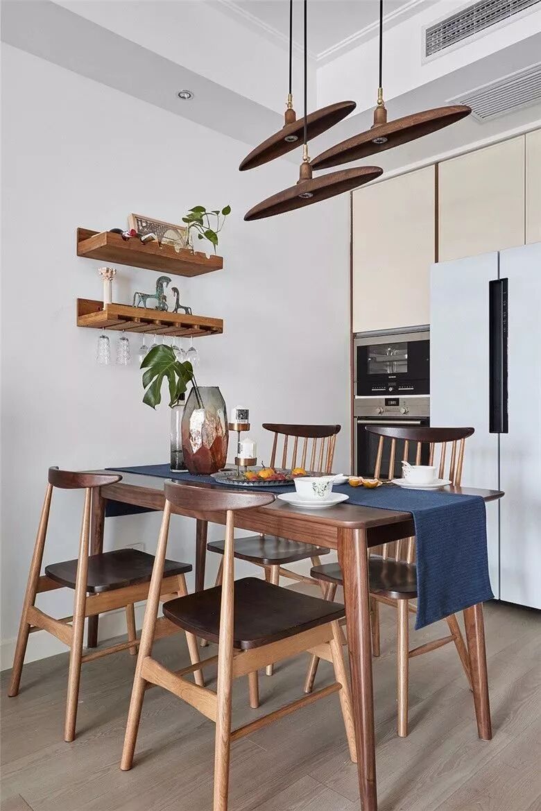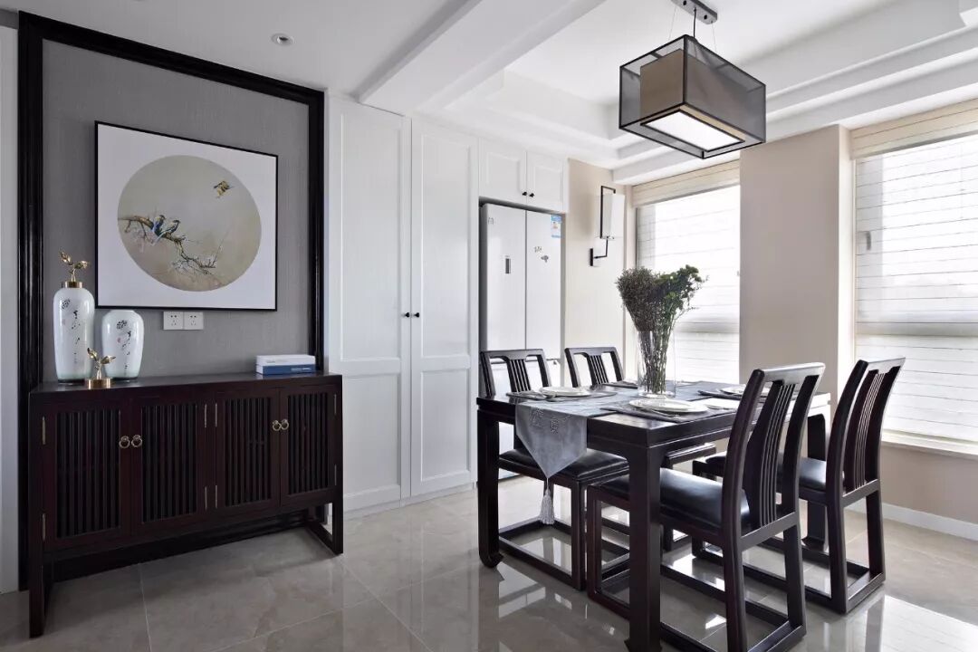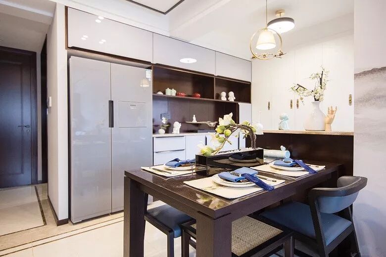 为了让冰箱在空间里不会显得太惹眼,在设计的时候就可以考虑好冰箱的款式,然后把冰箱嵌入到餐边柜里面,这样整体空间比较整洁大方,生活才更有仪式感!