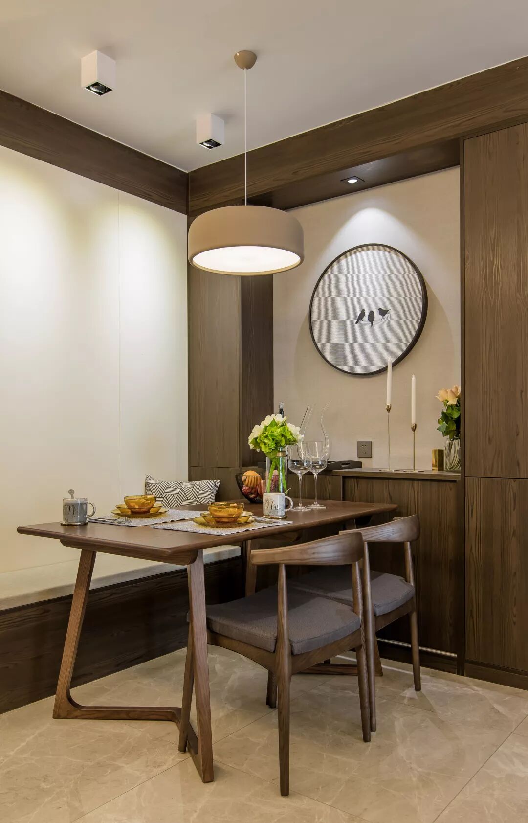 ▲餐厅设计成卡座,实用又不占用空间面积,米灰色的坐垫搭配深色的实木餐桌及餐边柜,层次感丰富。
