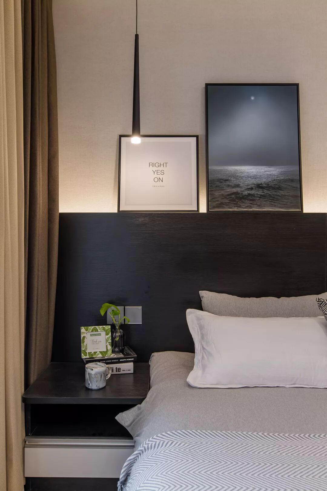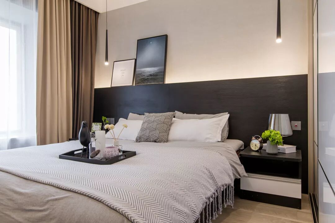 ▲主卧的色调是典型的黑白灰,为了避免过于的中性冷淡,所以搭配了暖色的窗帘,还有床头的灯光也会让卧室变得柔和温馨舒适。