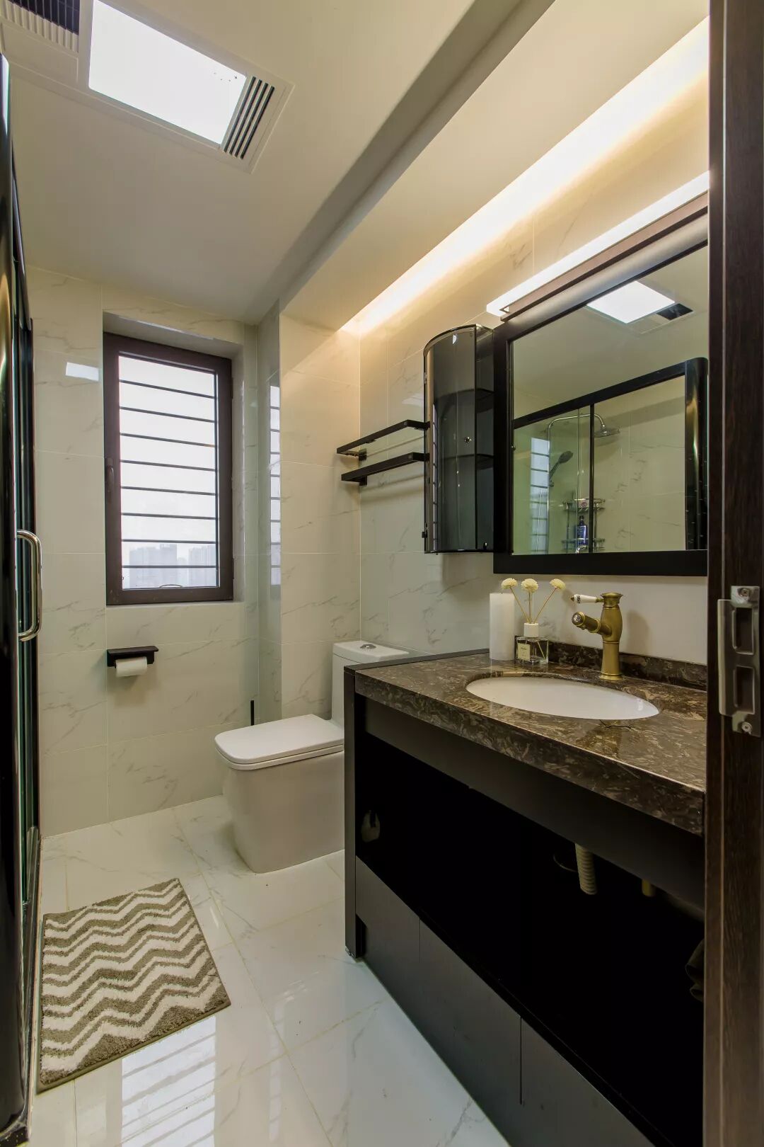 ▲卫生间天花采用防水石膏板刷防水乳胶漆,洗漱台正上方再加一条灯带,营造出一个时尚前卫的卫浴空间。