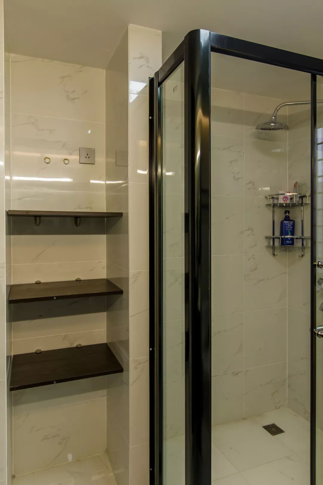 ▲黑色边框的淋浴房加黑色的五金件,与浅色的墙地面刚好形成对比,整体变得比较耐看。