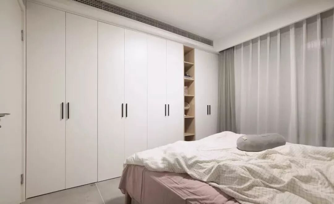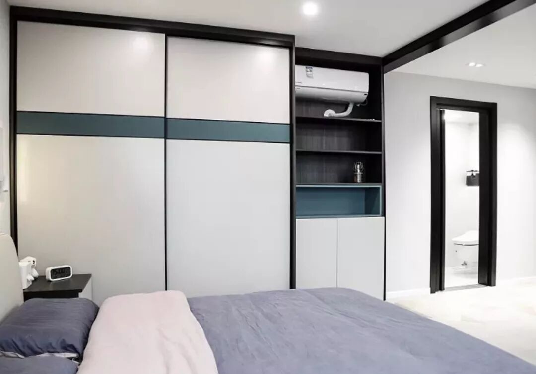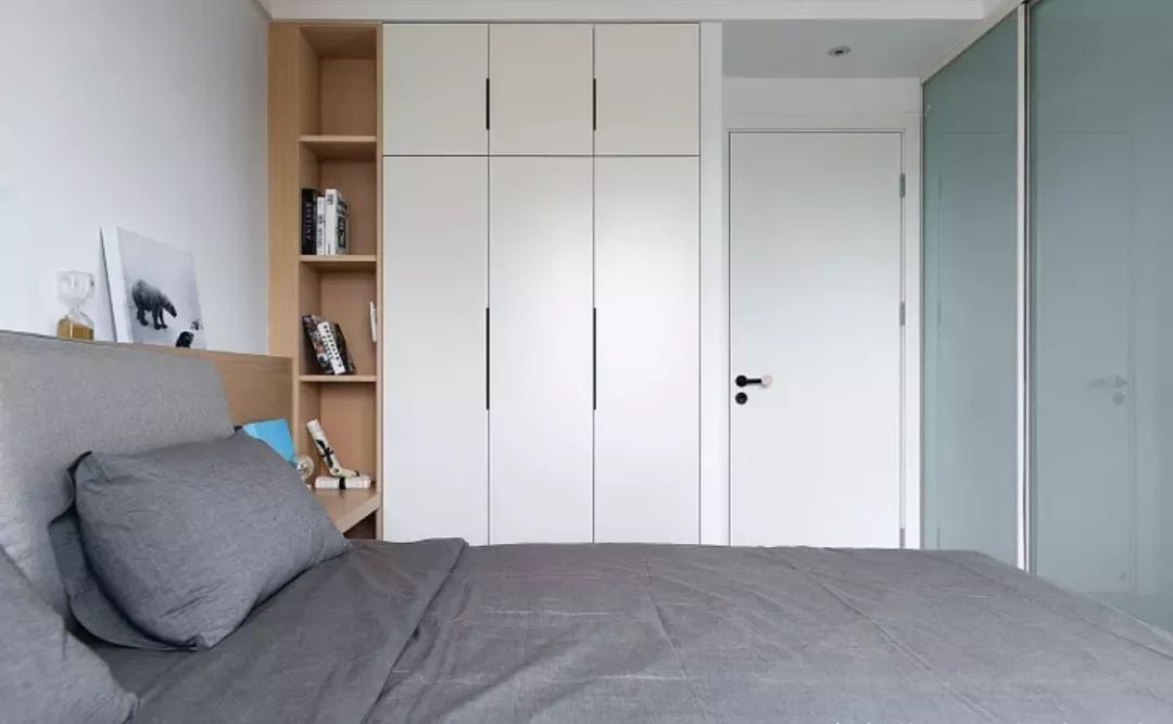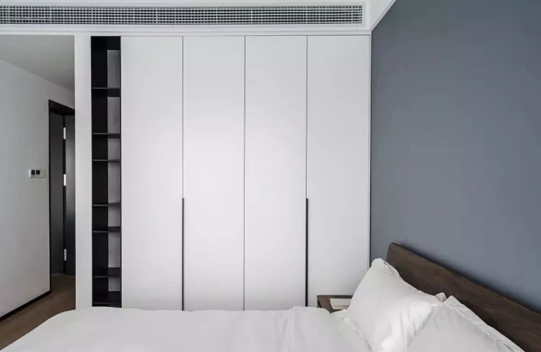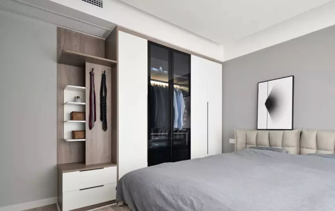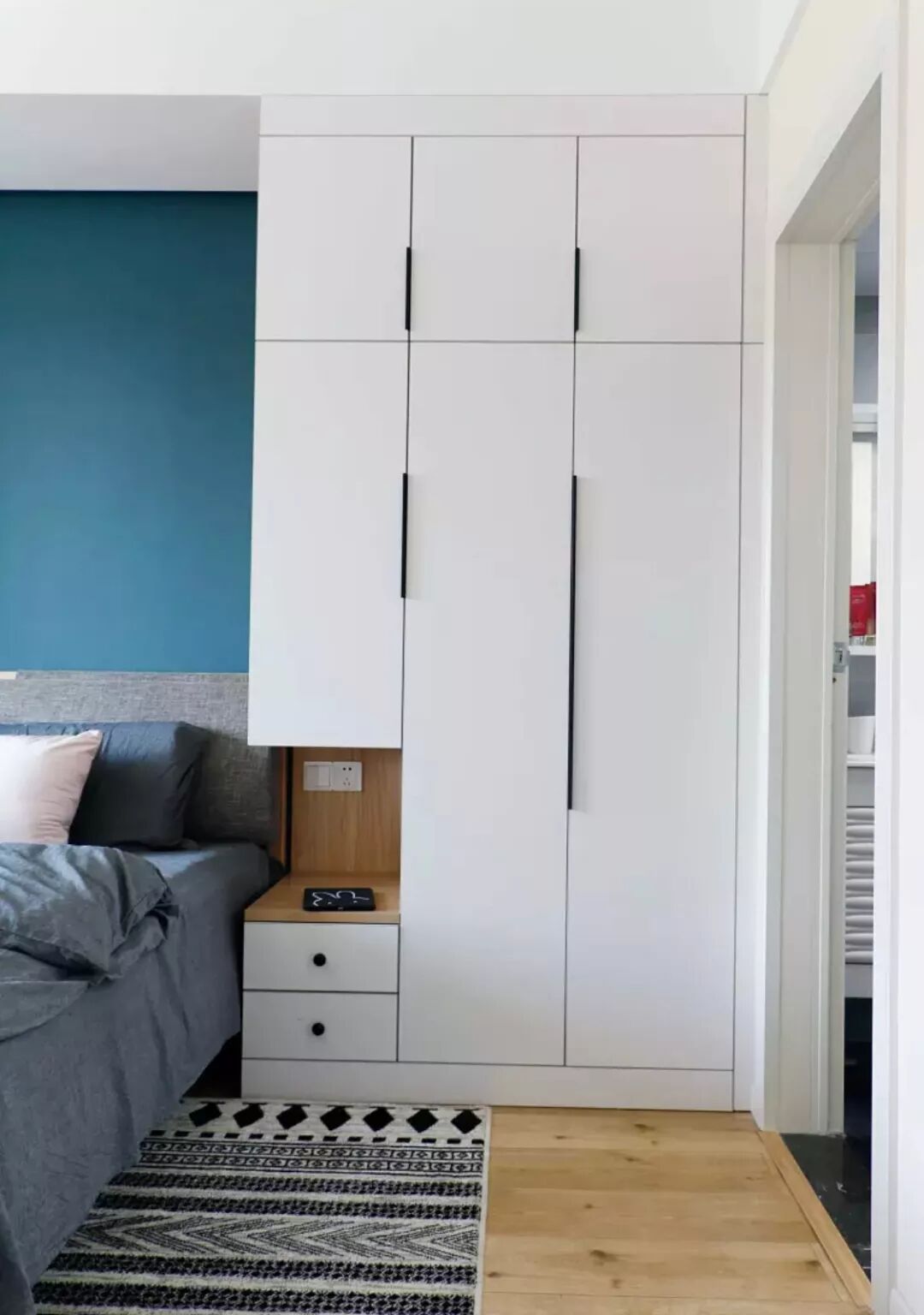 撞色衣柜,比较简单的做法就是在衣柜门里加入一块与整体衣柜不同颜色的柜板,结合整体软装布置,营造出一个优雅舒适的层次美感。