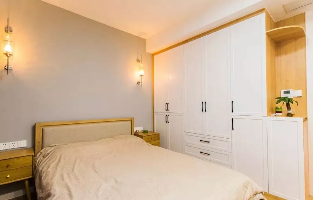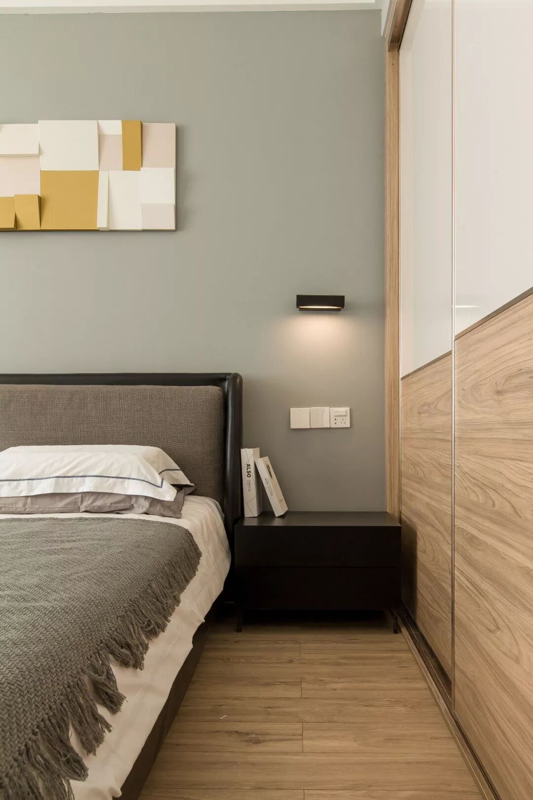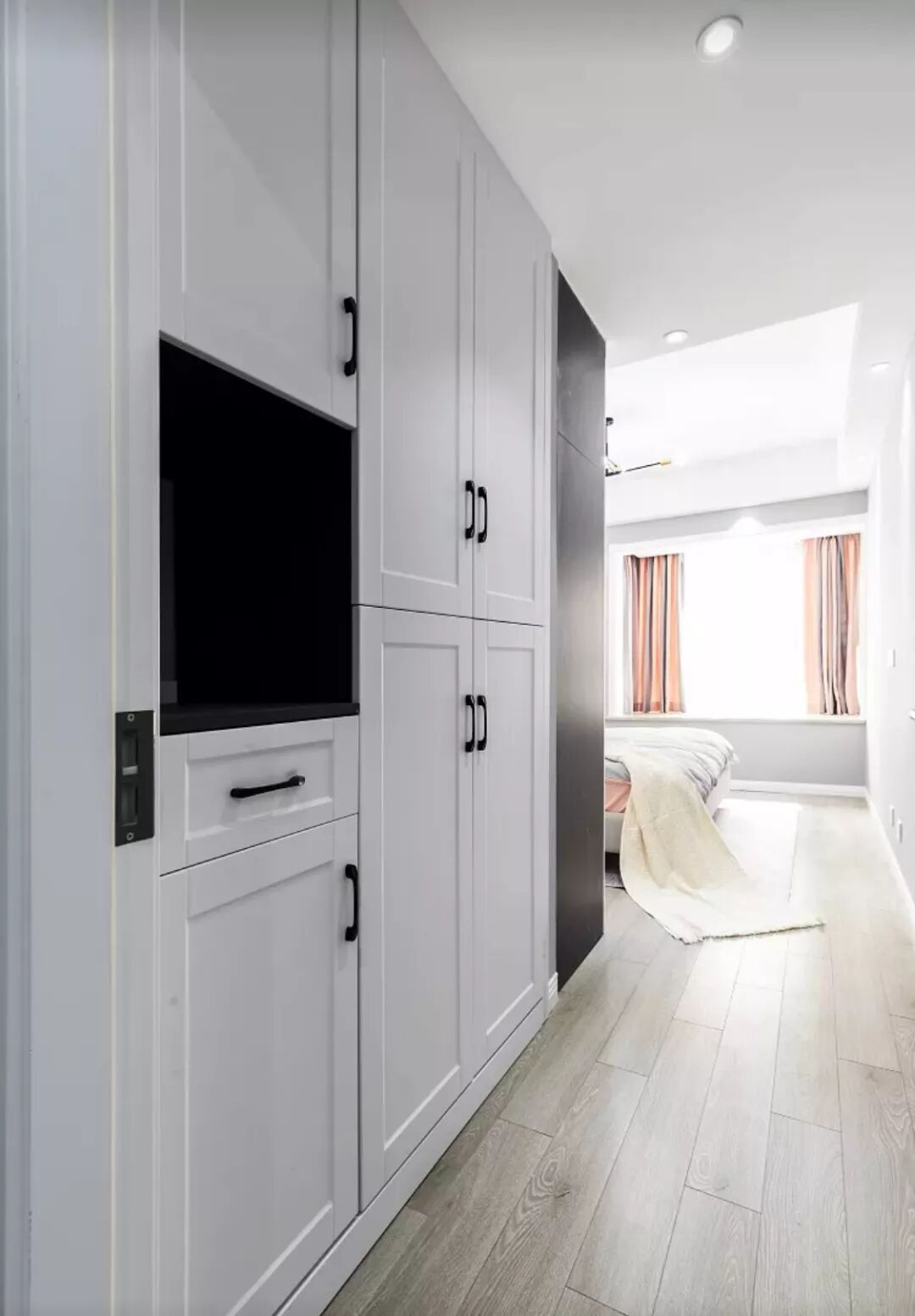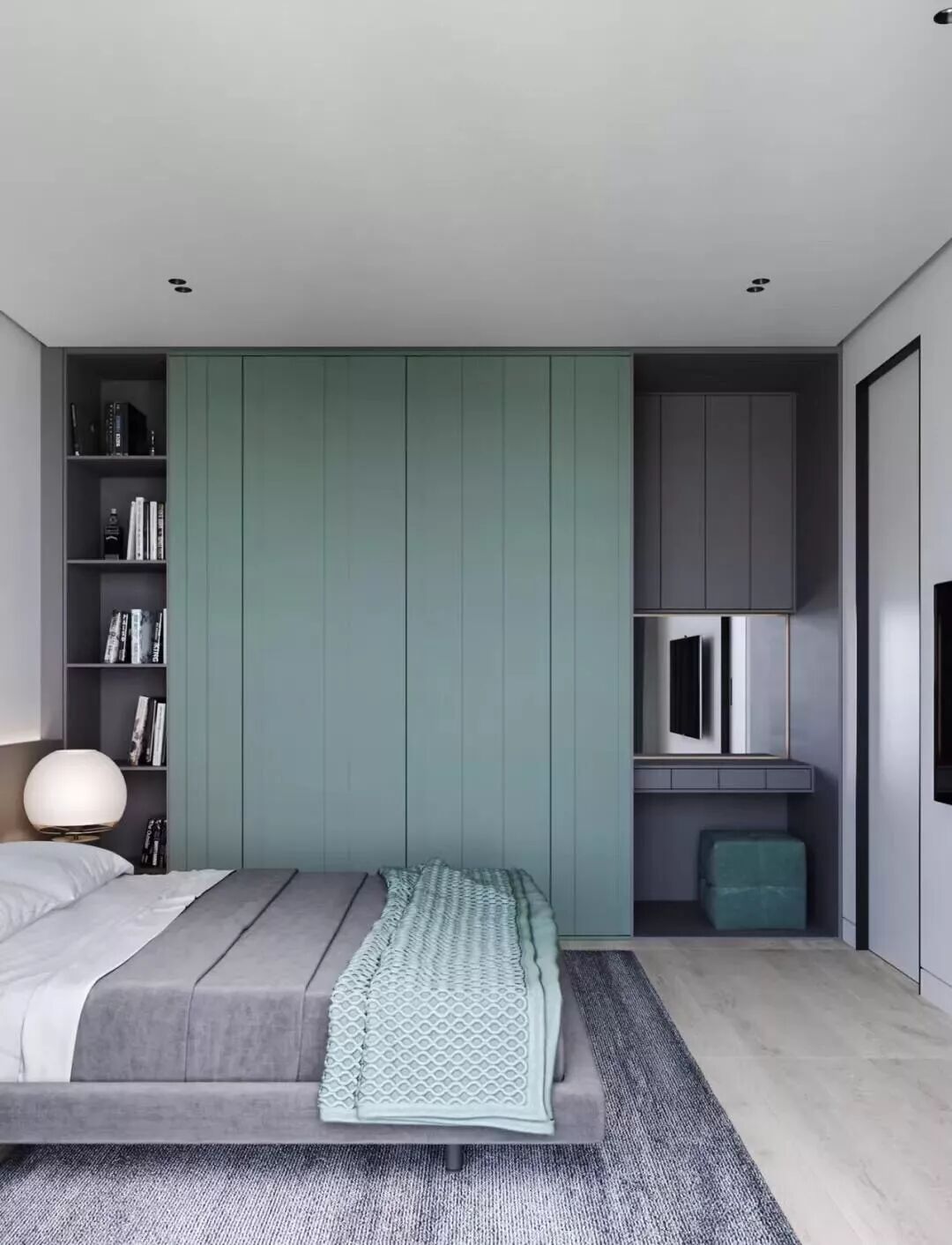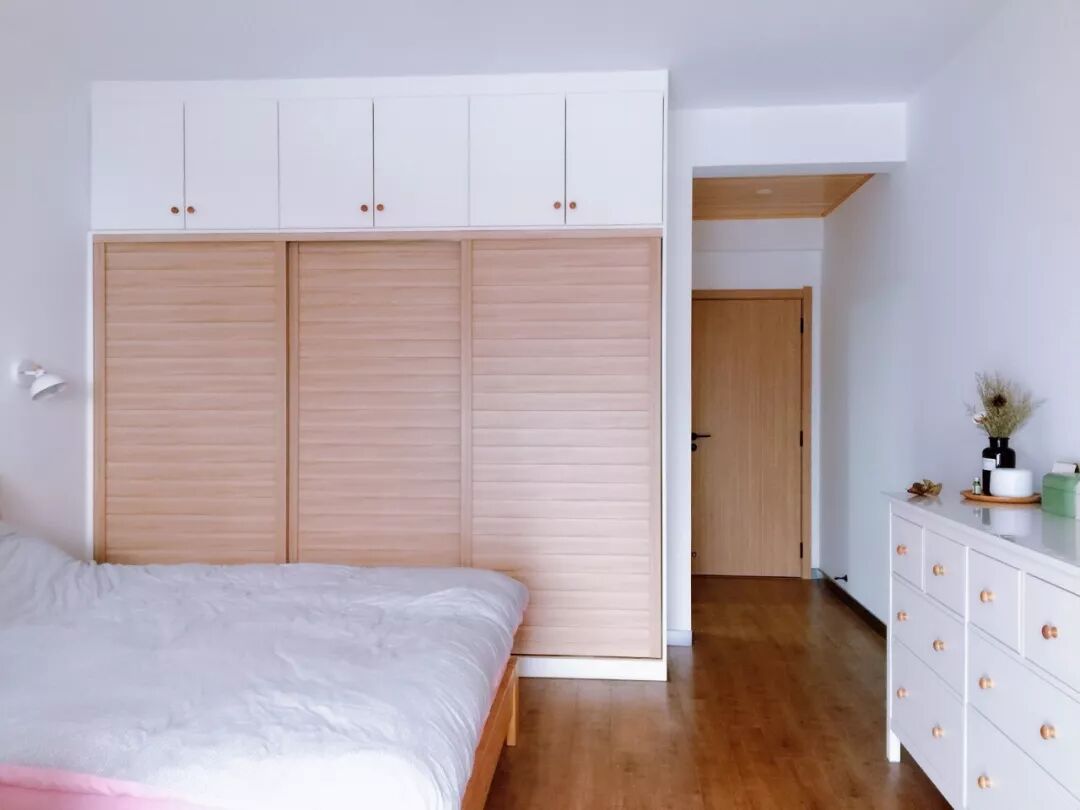 撞色衣柜,比较简单的做法就是在衣柜门里加入一块与整体衣柜不同颜色的柜板,结合整体软装布置,营造出一个优雅舒适的层次美感。