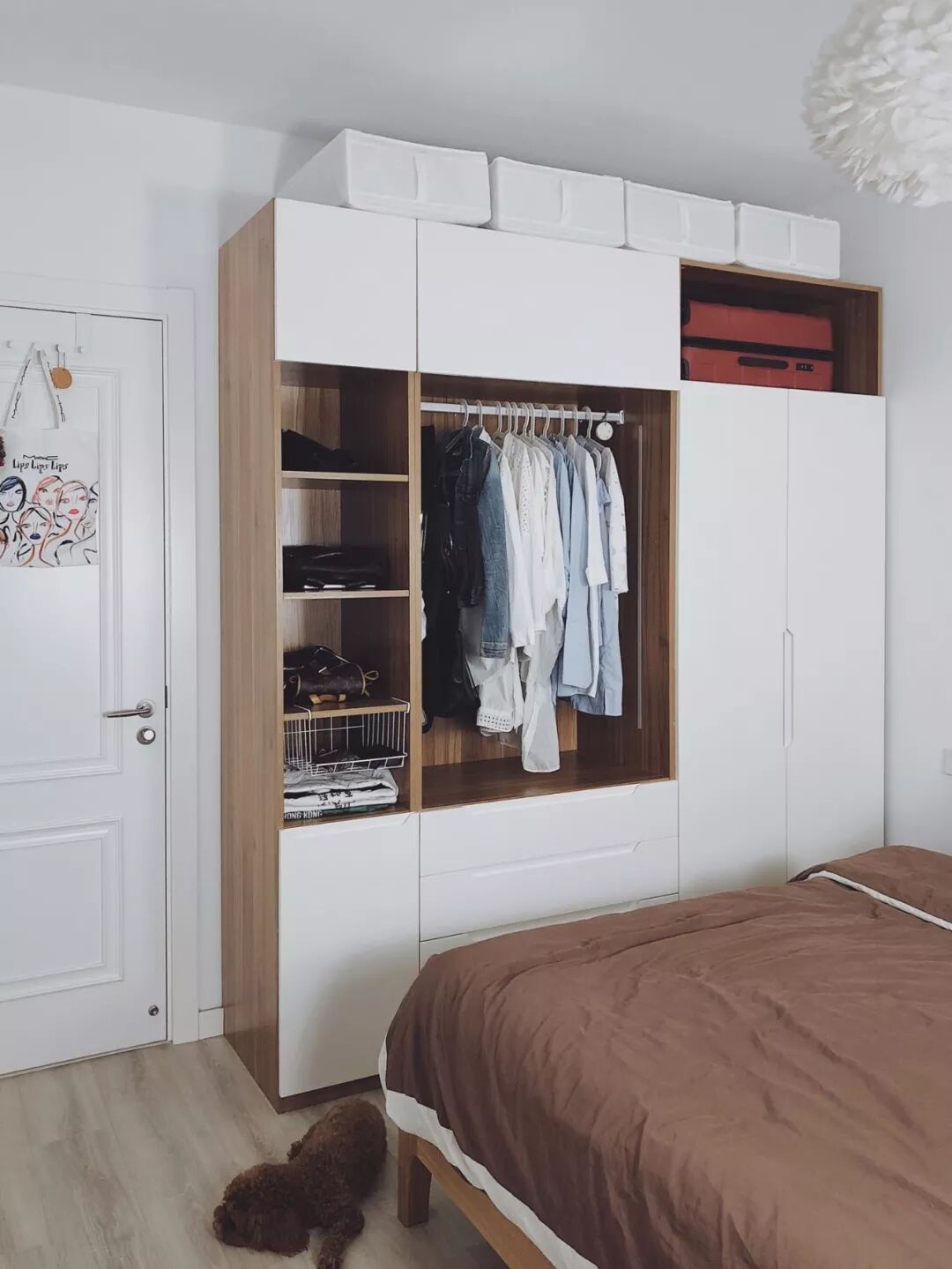 如果衣柜足够大,也可以考虑在衣柜里加入一个开放的格架,与衣柜主体不同颜色的格架,并把格架作为存放展示品的位置,整体空间会显得宽敞舒适而又有层次。