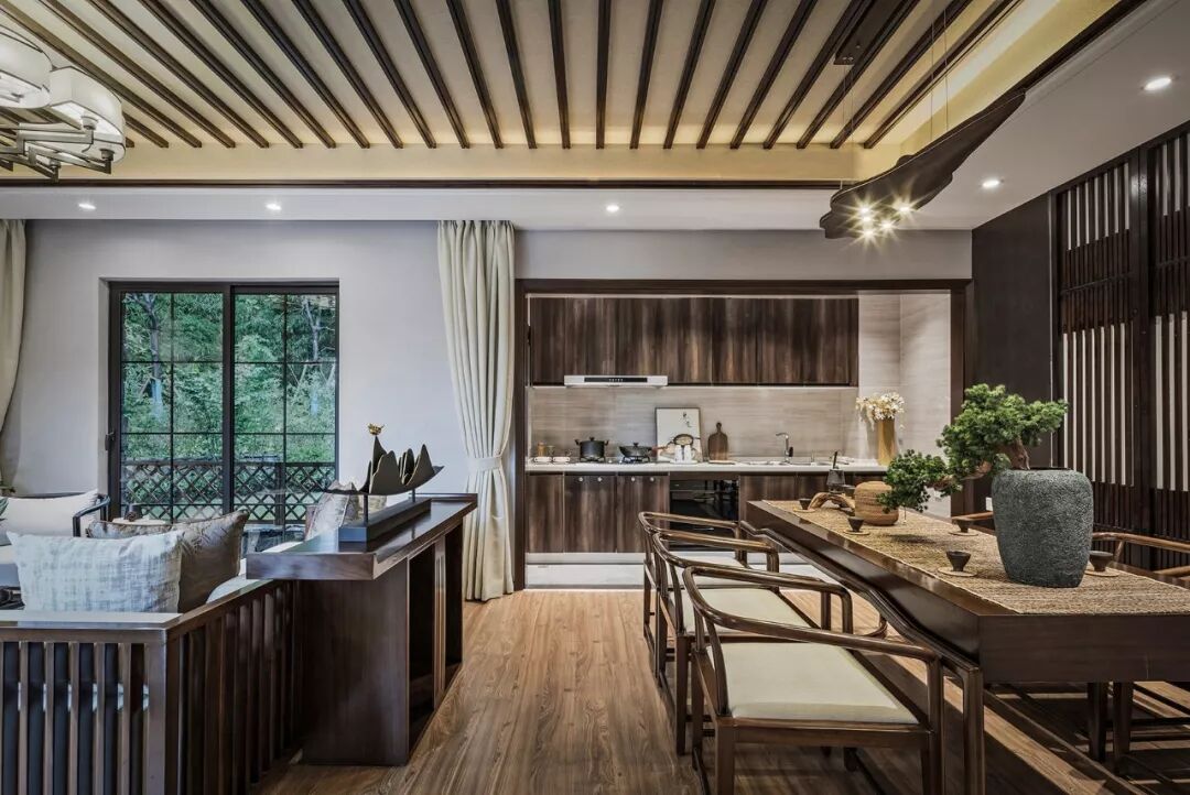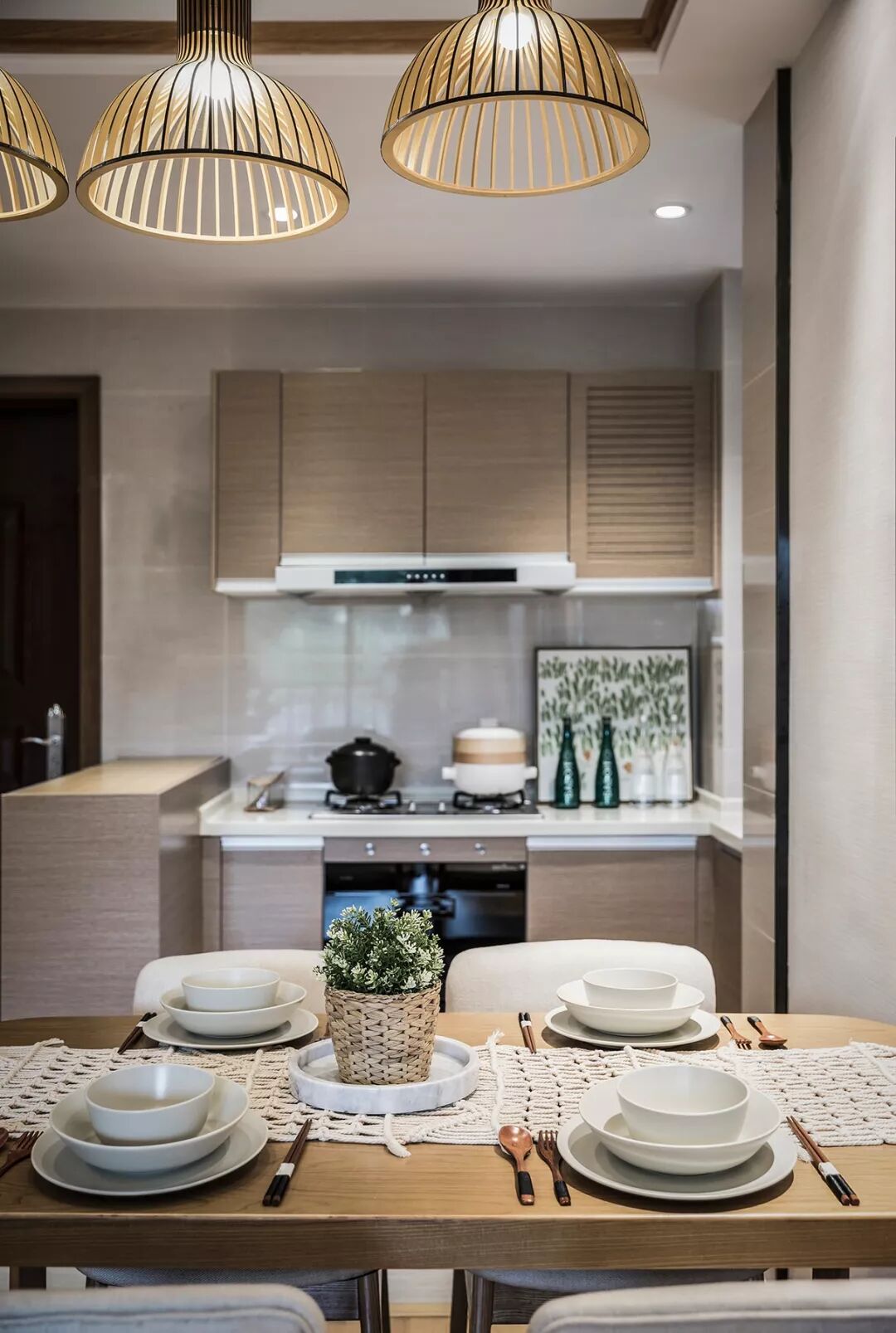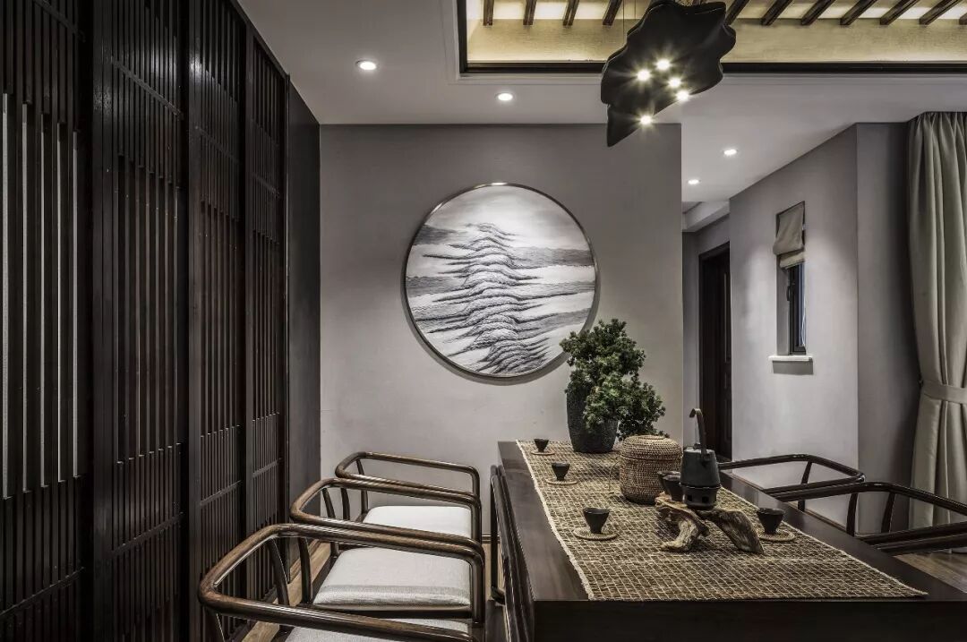 硬装布局以“开放、包容”的生活态度为至上,不止客厅设计左右双向门窗,开放式餐厅,也瞬间拉近了心理上的距离,传统的中式餐桌椅,搭配饱含东方韵味的圆形水墨画,以及编织感桌垫与摆件,人文墨客推杯换盏的隐居生活画面,悠然而惬意!