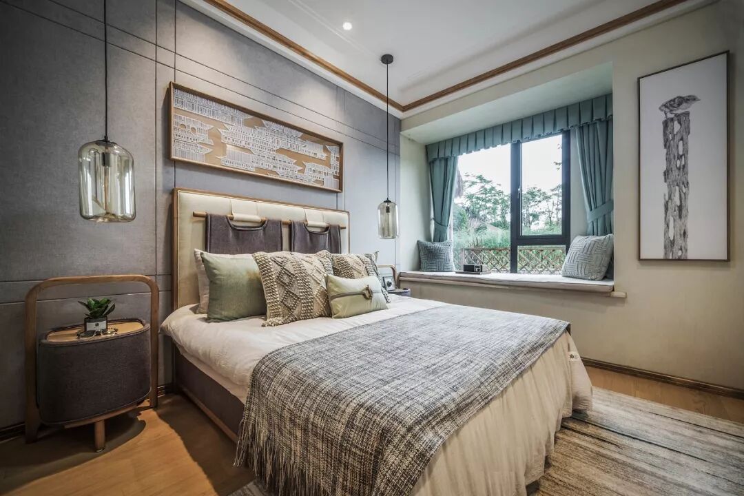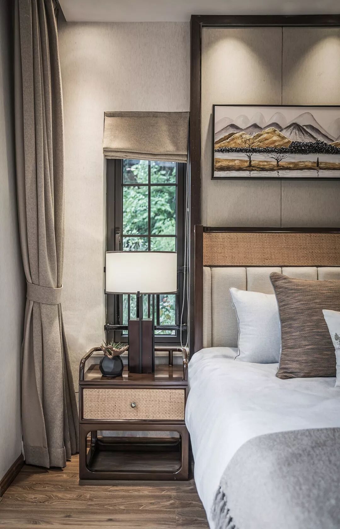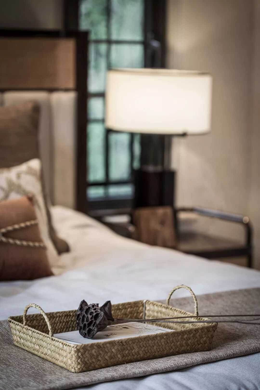富有沉淀感的木的质感带来一室的安宁,床头背景的玻璃开窗亦让静雅的空间焕发灵动的生气,户外的葱翠伸手便可触及,山野的芬芳在流动的空气里尽情释放,自由的灵魂得此安放。
