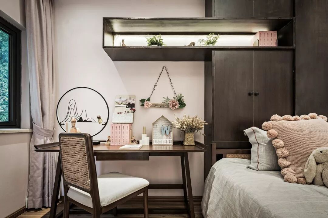 儿童房的小牛坐凳充溢着乡野般的稚趣,柔化了室内与室外的边界,墙面澄净的粉蓝,舒目而又浪漫。主卧室麻料质感的床上织物,轻易将人带入一个文艺的世界里,窗外碧绿的山色就这样闯了进来,和着清鲜的青草香,鼾甜入梦。