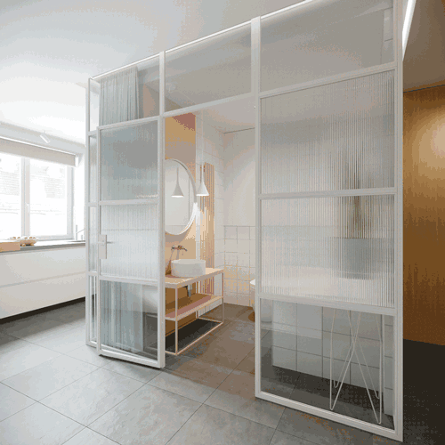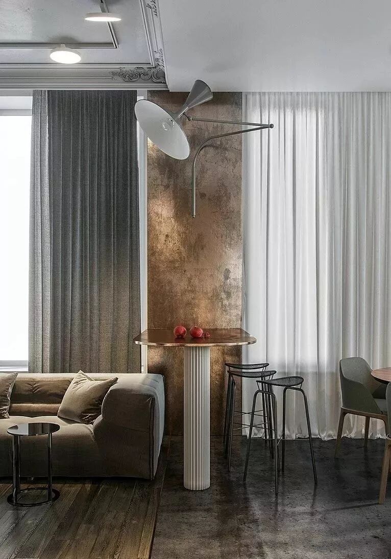 41.48m²莫斯科现代风格小公寓,其实这并不是一个好户型,卫生间位于入户门的正前方,设计用“玻璃+帘子”的形式对其进行了区隔,以兼顾隐私和采光;厨卫空间的另一侧为卧室和客厅部分,之间也用帘子隔开,窗台处理还是不错的,与很多国内的户型类似,不妨参考一下吧。