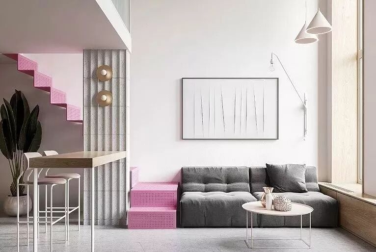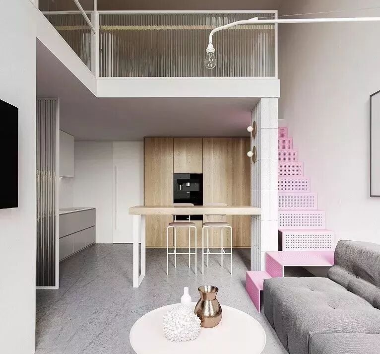 43.59m²北欧LOFT,玄关区、楼梯和卫生间,都很有创意和个性,在使用天然的材质带来舒缓的气息后,又通过小面积的色彩点缀,营造出生机与俏皮。