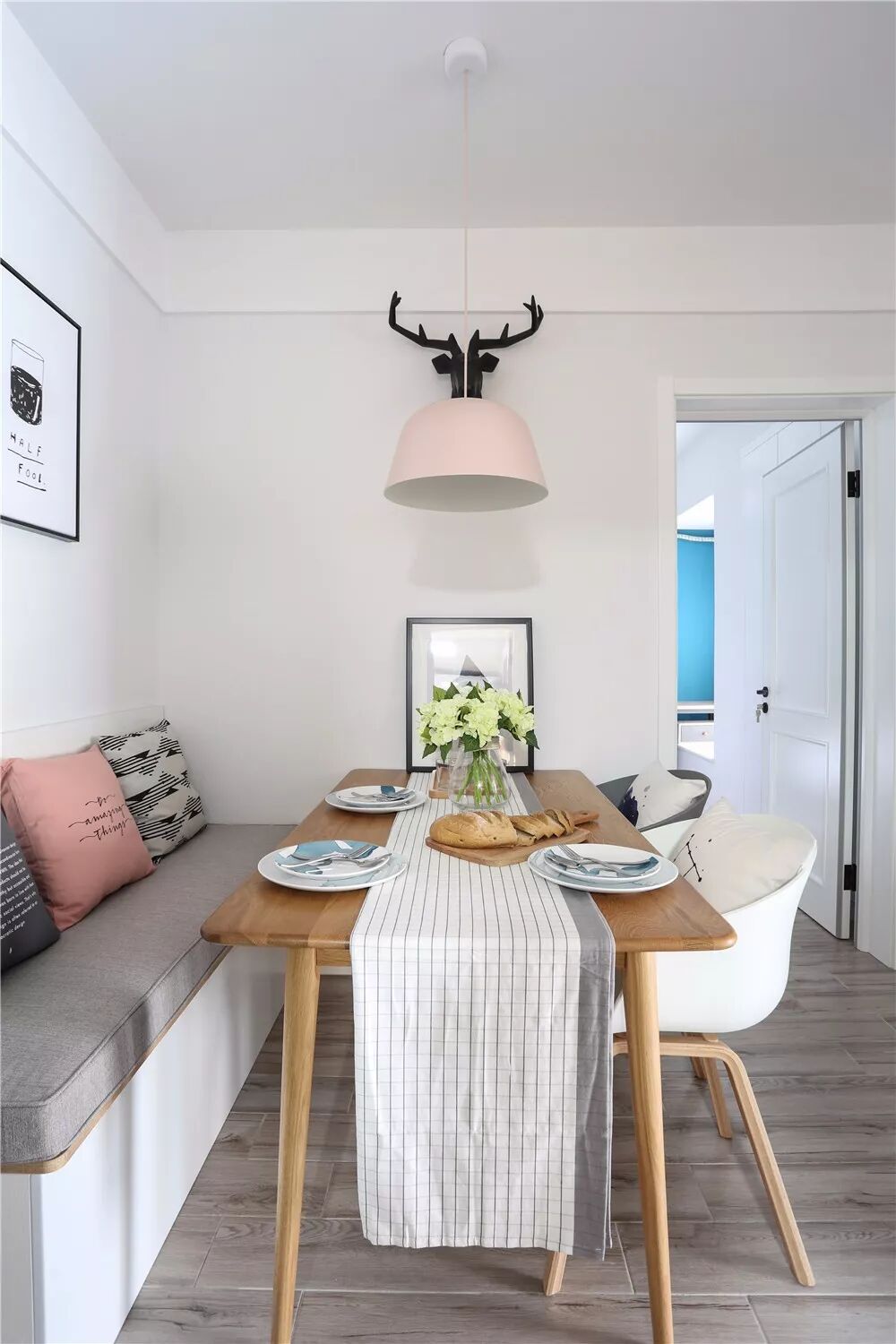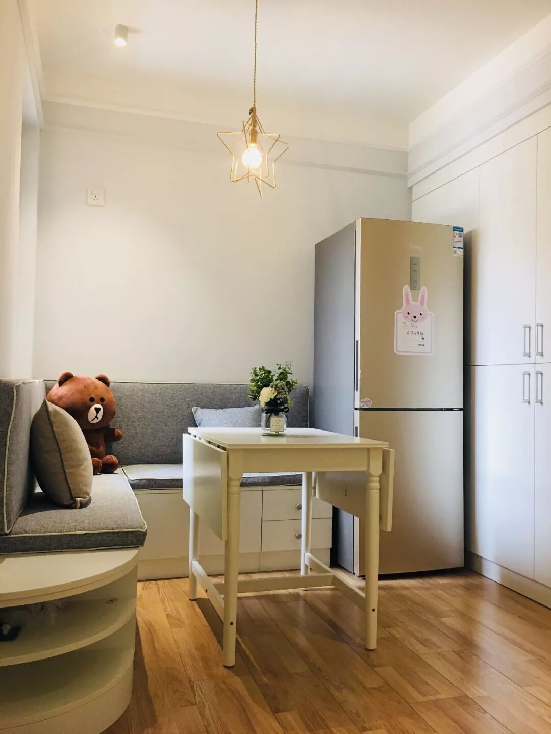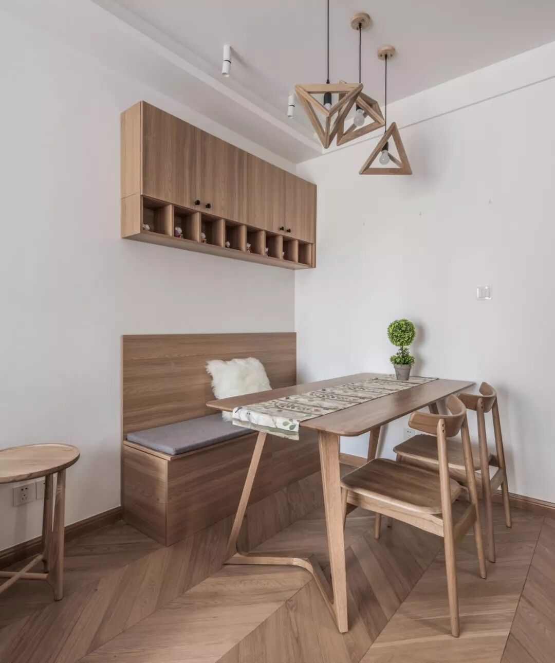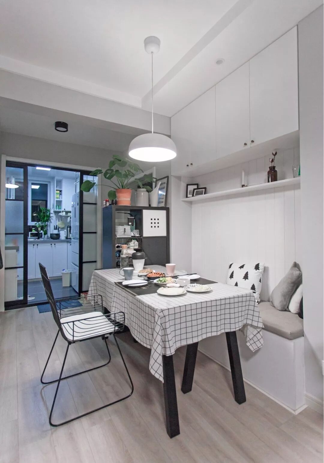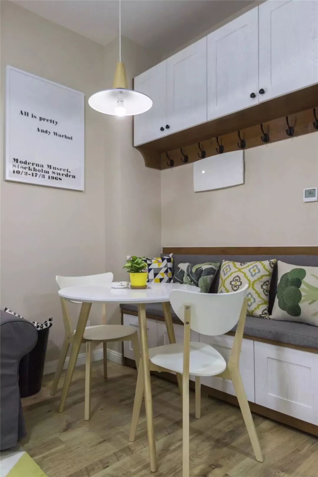 收纳对于小户型来说是非常重要的事情,卡座本身底部就有着收纳空间,上方的墙面还可以做个吊柜,非常实用。