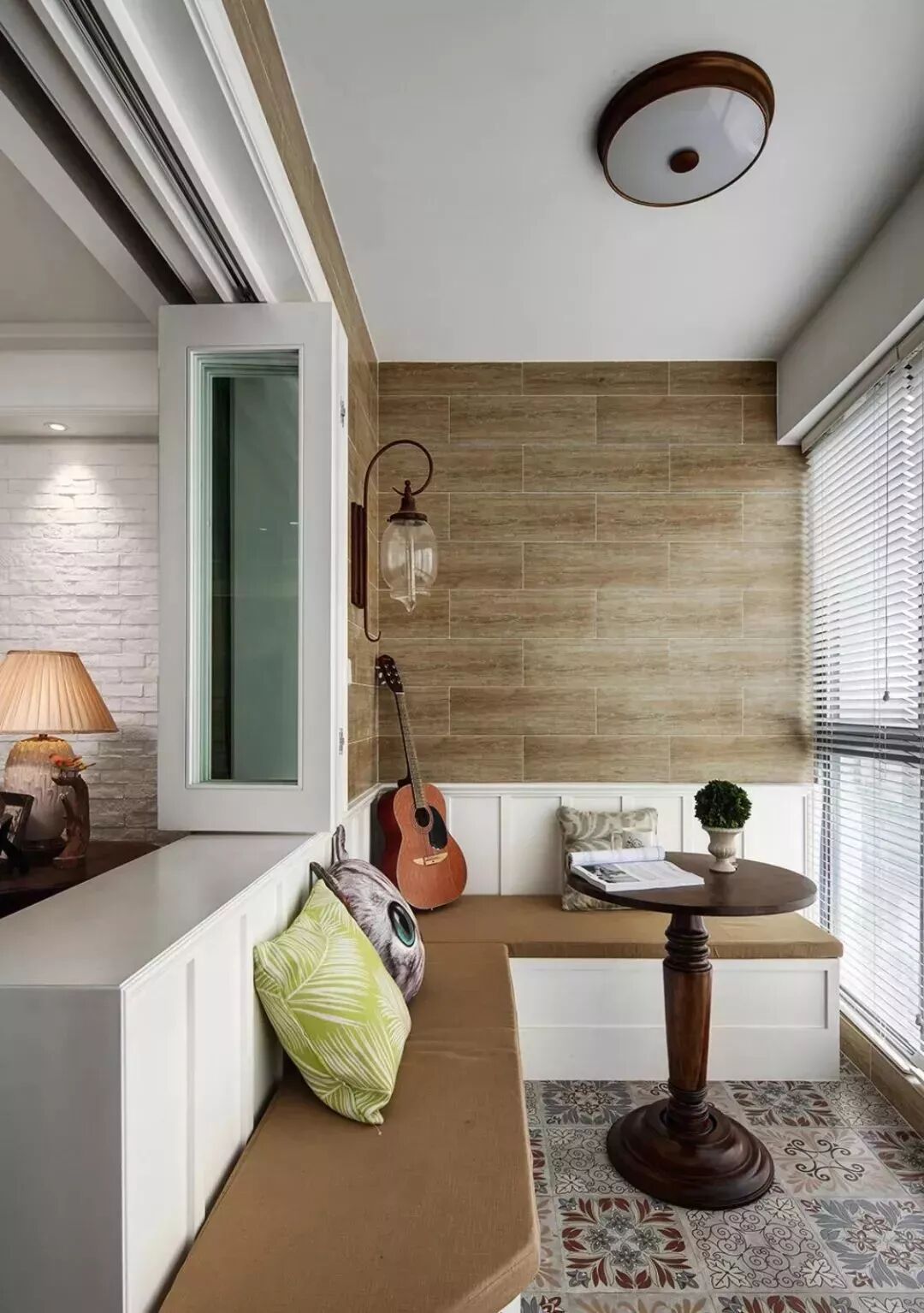 还有洗手台本身和柜子也是能够提升阳台颜值的设计,田园风的仿古砖和柜子,让阳台也多出了休闲的感觉。