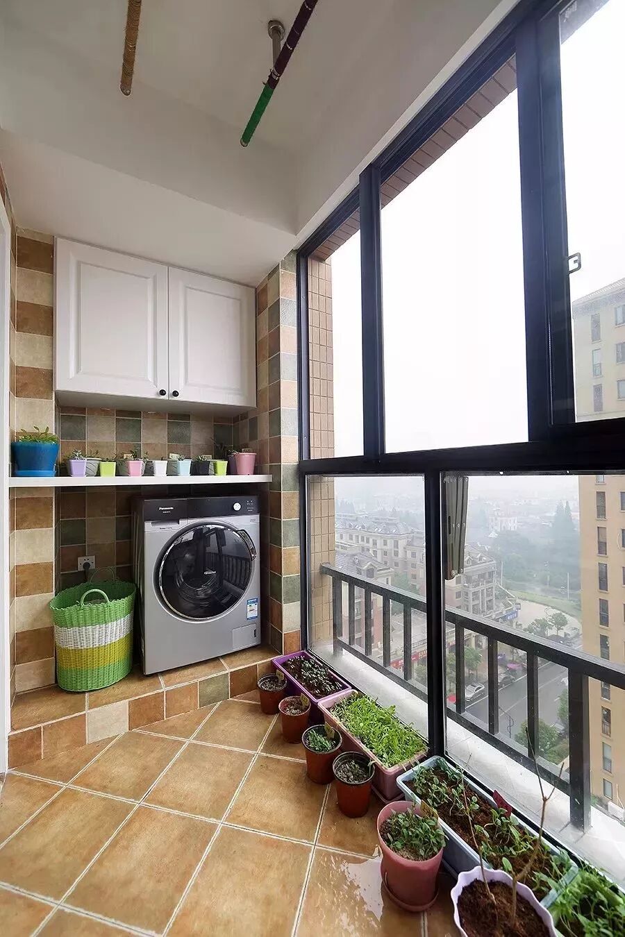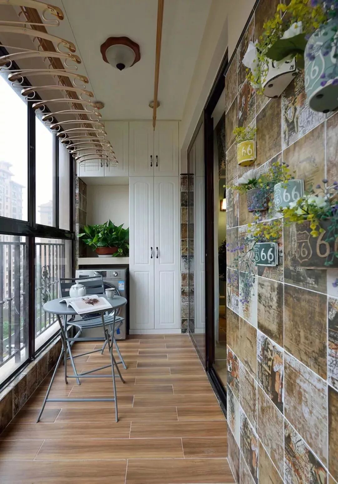首先最简单就是给阳台换上时尚的包装,就是地砖和墙砖,选择好看的瓷砖或者木地板,让阳台的颜值得以提高。