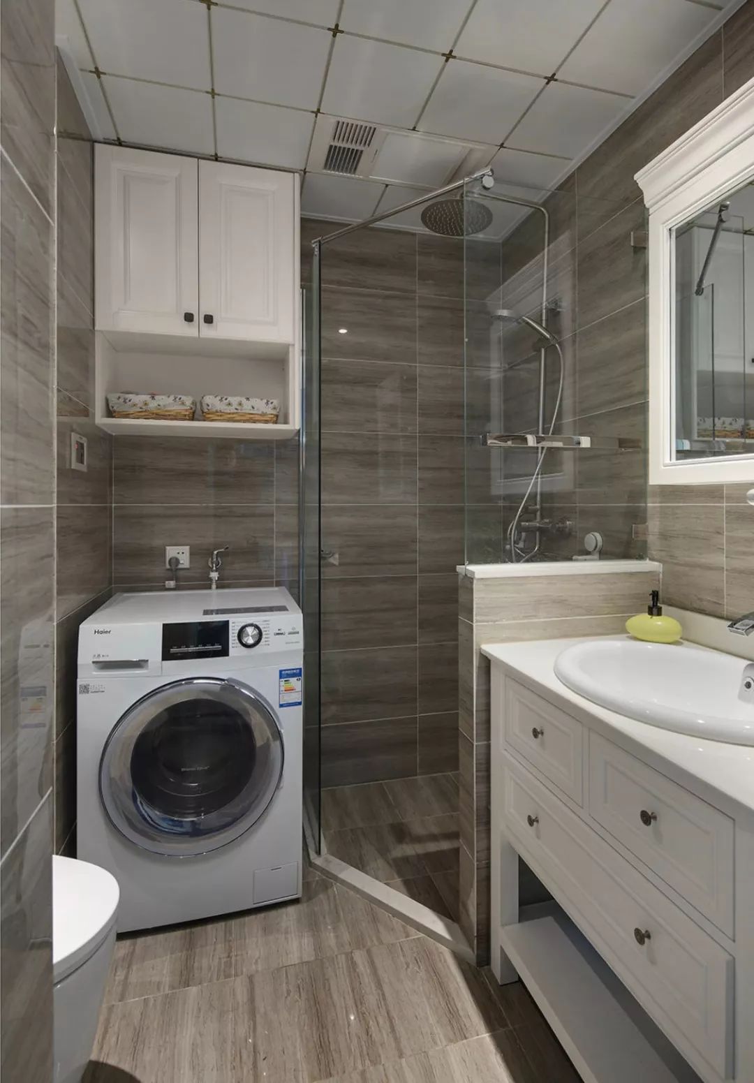 卫生间里面放置洗衣机,可以结合洗手盆设计,把洗衣机藏到洗衣机里面,这样可以把洗衣机上方利用起来,成为洗手台的一部分。