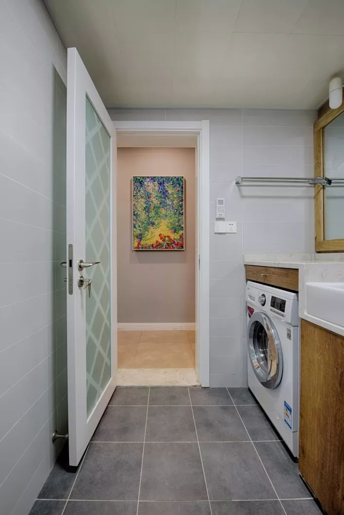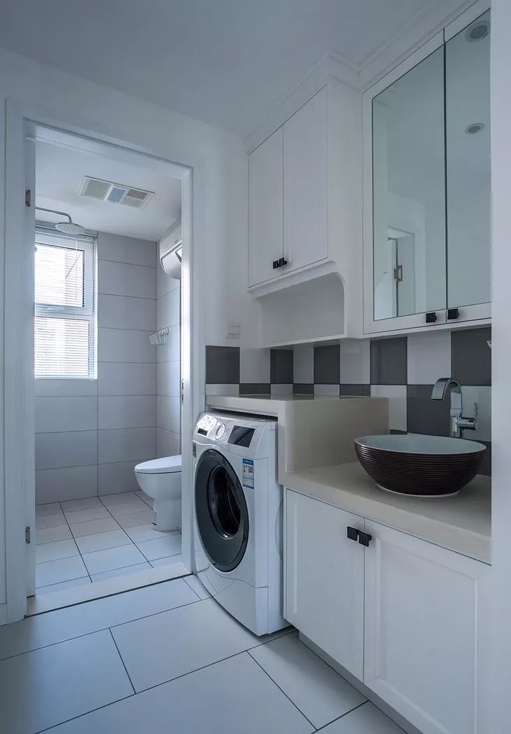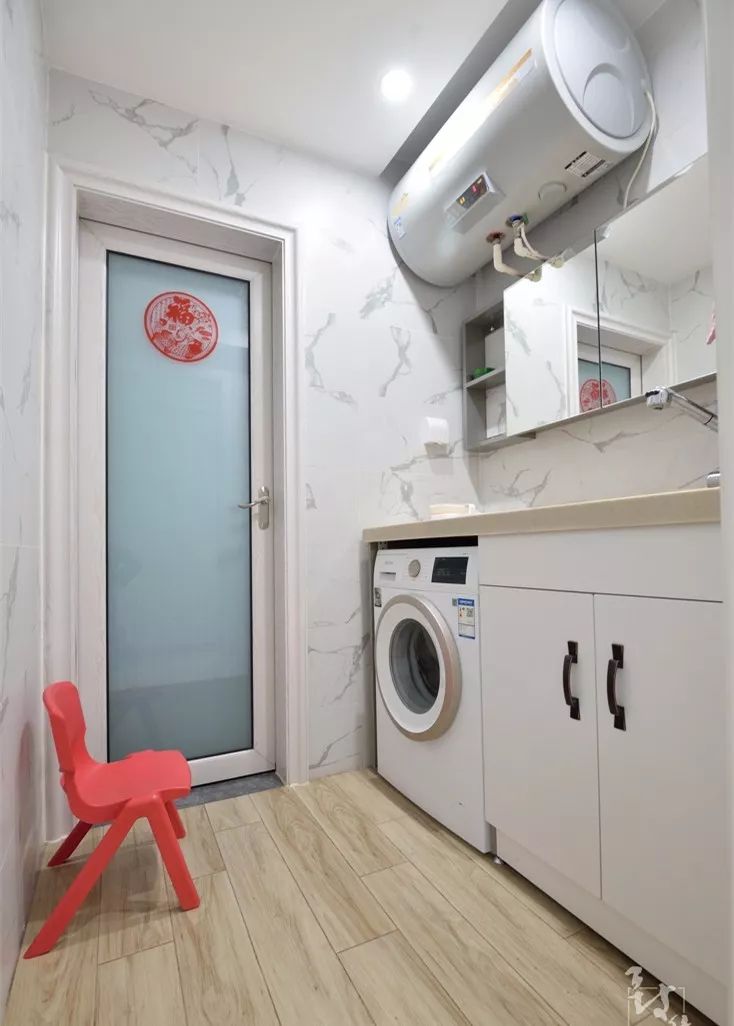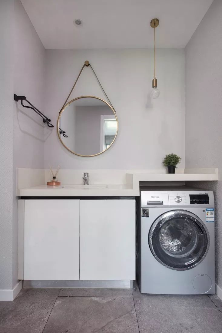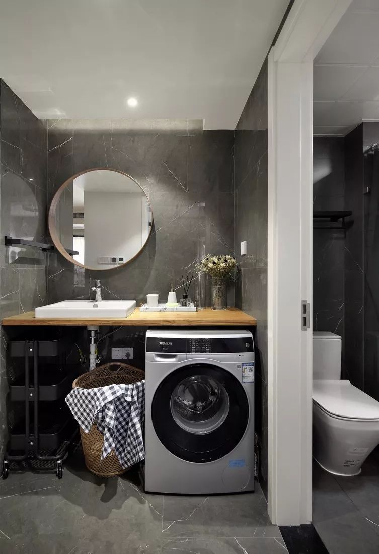 摆放洗衣机的地方,需要满足进水与出水的条件,除了阳台,比较符合这条件的就是卫生间了。把洗衣机放在卫生间里面,也是一个比较方便的选择,洗澡的时候脱下的衣服就可以顺手塞进洗衣机,这就大幅缩短了生活动线与时间,洗澡洗衣一条龙,手洗的衣服也可以立马放到洗衣机里面脱水。