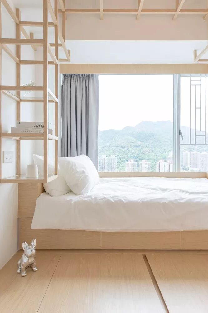 双层台阶木质纹理平台床与窗户隔间对齐,墙面和地面的存储空间设计的很微妙,也为以后饰品的增加预留了可能性。