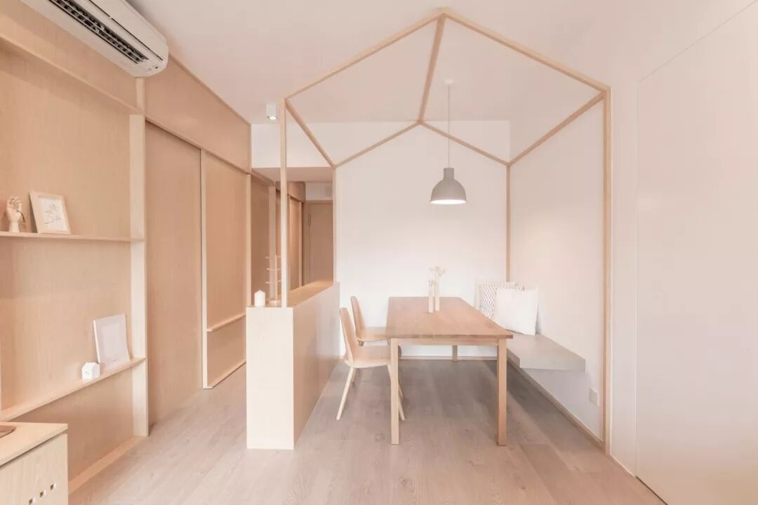 更引人注目的是,设计师创造了一个用于分区用餐区的房屋形状的木制框架。