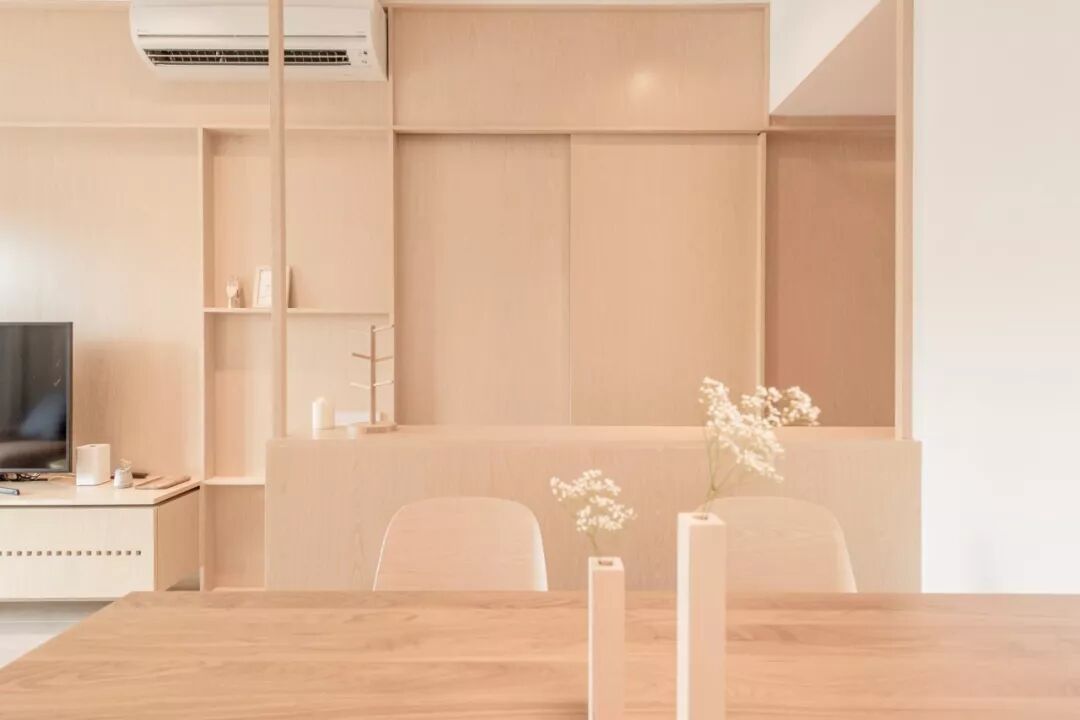 在主要活动区域,设有干净、巨大且多功能的木质纹理墙,带有两个推拉门,用于储藏室和厨房。