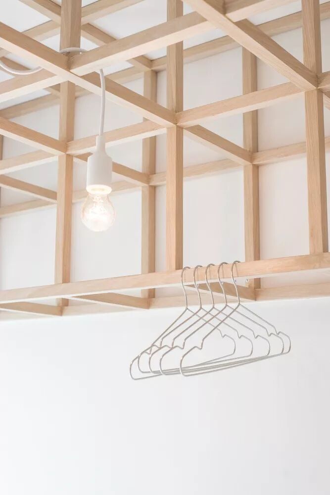 这个有形无体的房顶造型由几个简单的木条组成,将各个空间区域分割开来,同时仍然可以看到整体空间的全貌。