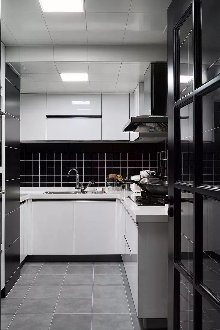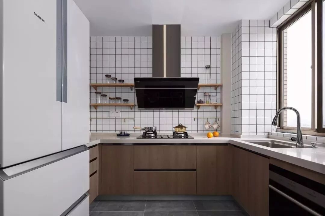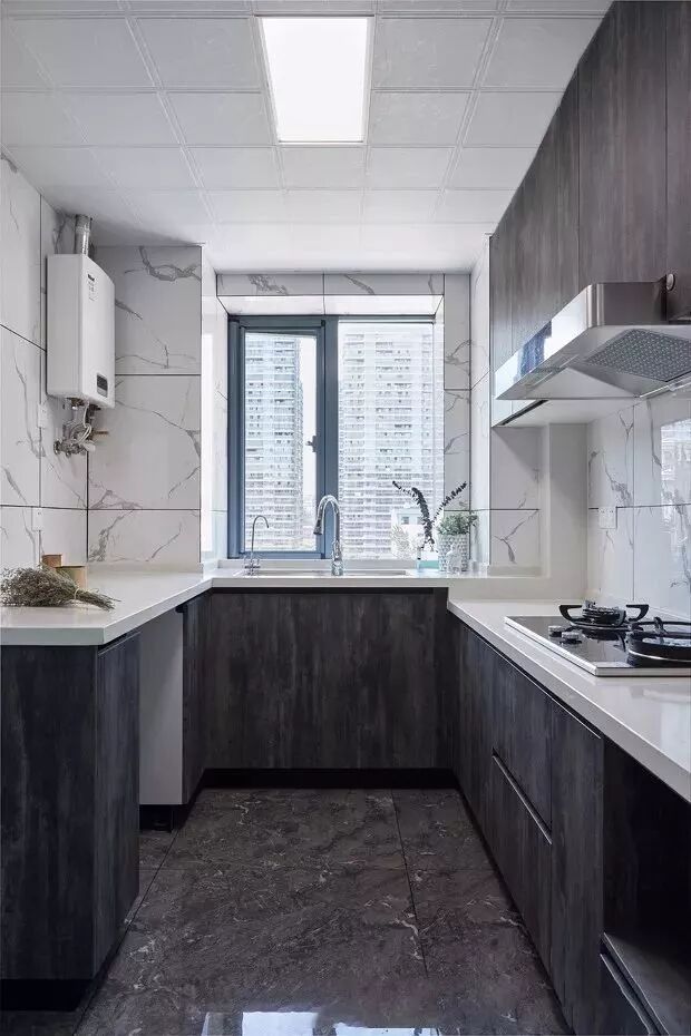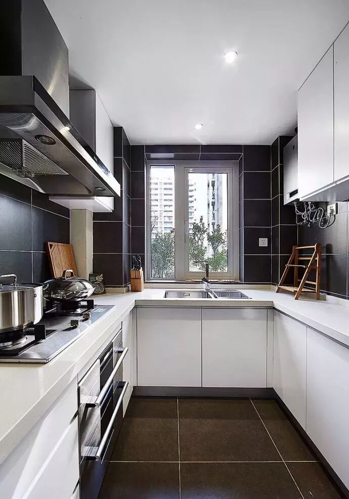 U型厨房应该是所有厨房布局中最为实用的一个设计,当你置身其中,三面挨着操作台,洗-切-炒-起锅的操作都在转身之间可以完成,非常的方便!