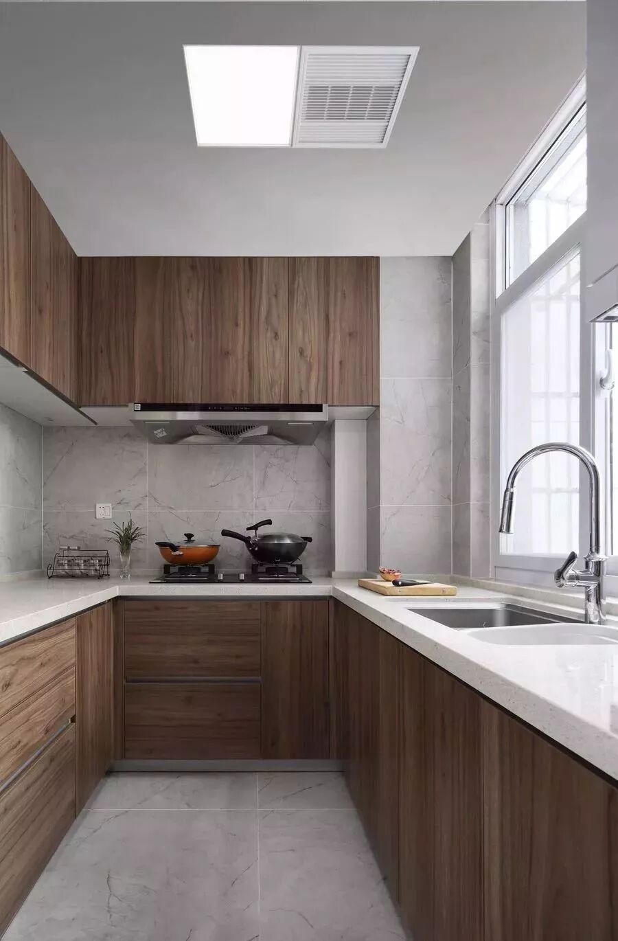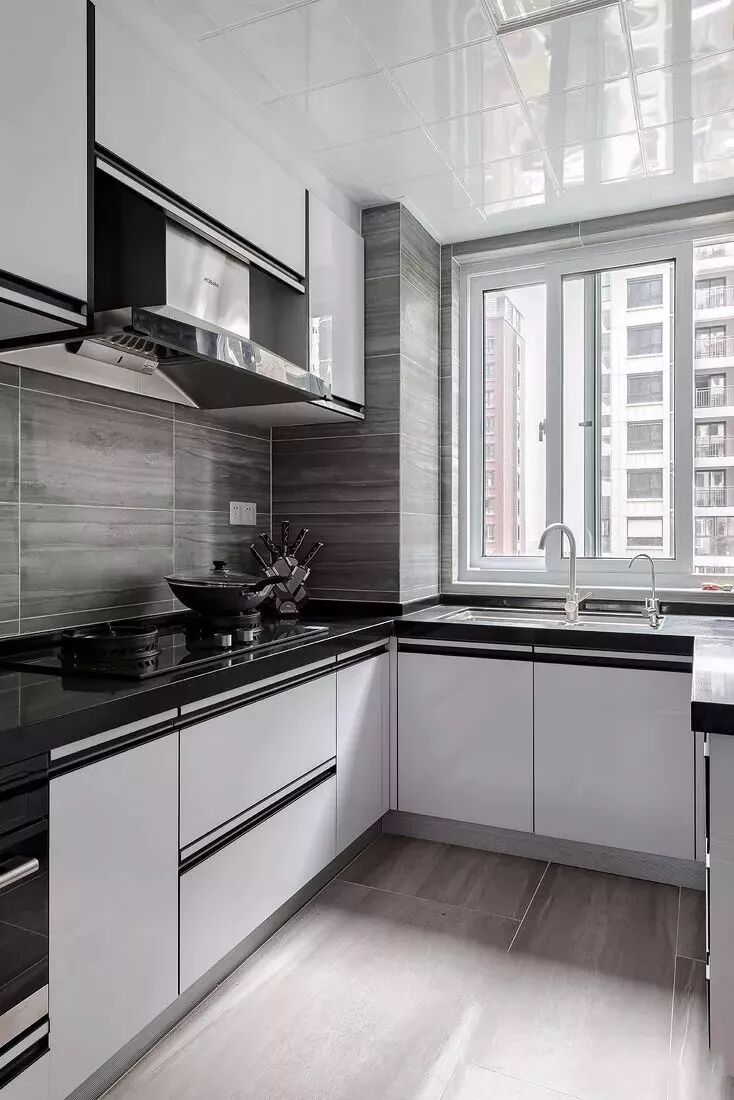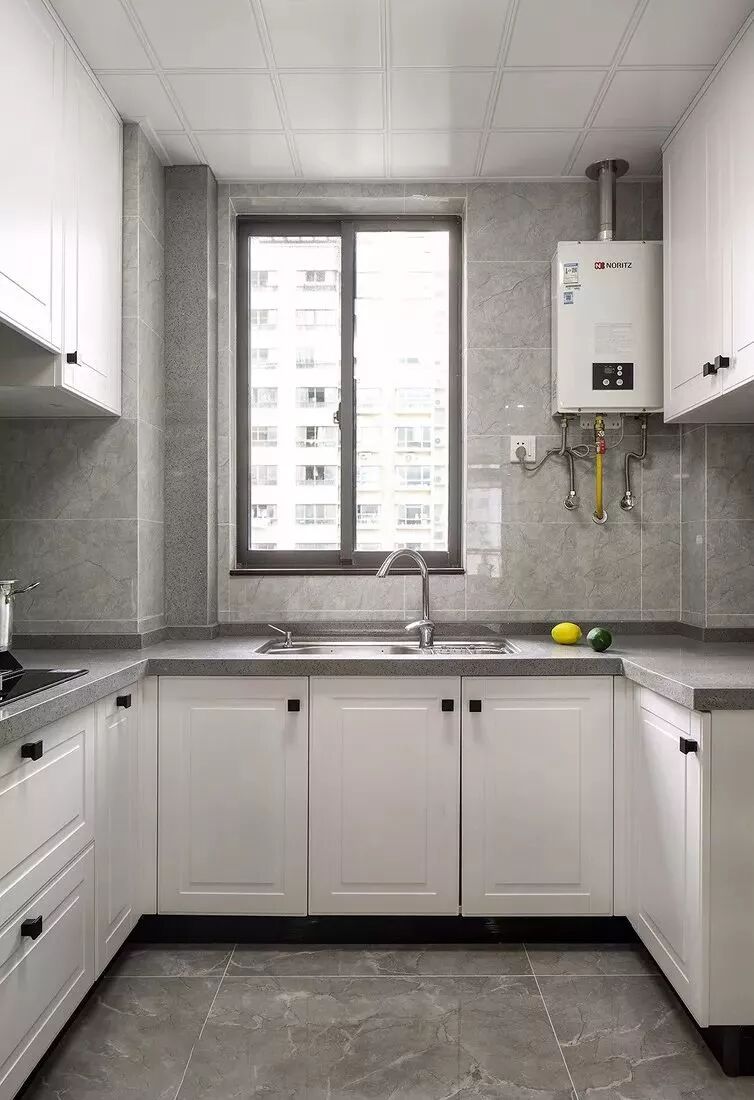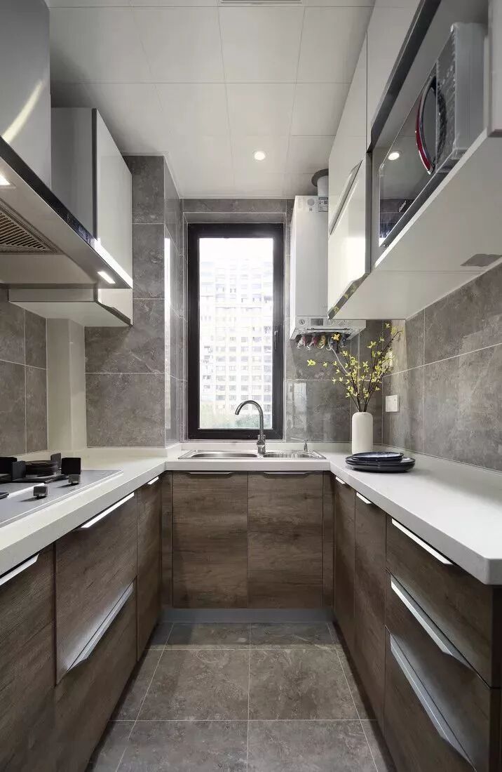 U型厨房应该是所有厨房布局中最为实用的一个设计,当你置身其中,三面挨着操作台,洗-切-炒-起锅的操作都在转身之间可以完成,非常的方便!