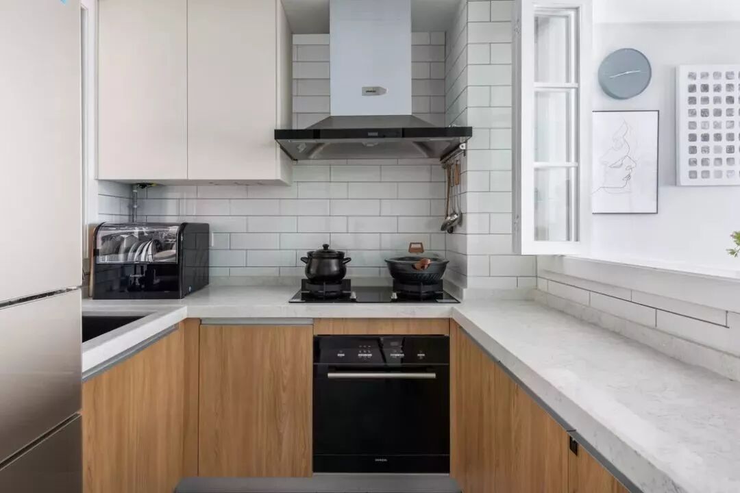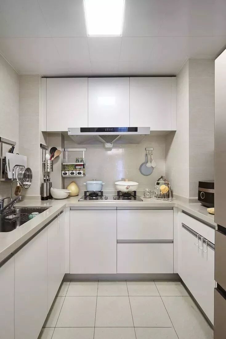 如上图所示:操作台最小尺寸600mm,过道空间最小尺寸800mm,按这个计算,想要做U形的厨房,最小的厨房尺寸应该是2.0米×1.4米,这是能装出最小的U形厨房的尺寸了!下面,来看看别人家U形的厨房是怎么装修布置的吧!
