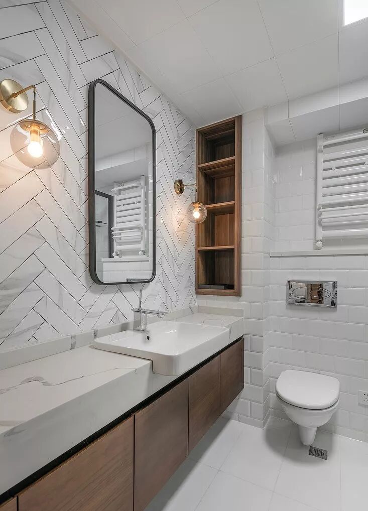 可以把某些地方的墙比如背景墙、餐边柜、书架,还有洗漱台、橱柜、洗手间…...挖掉一部分,做成壁龛,充分利用空间。
