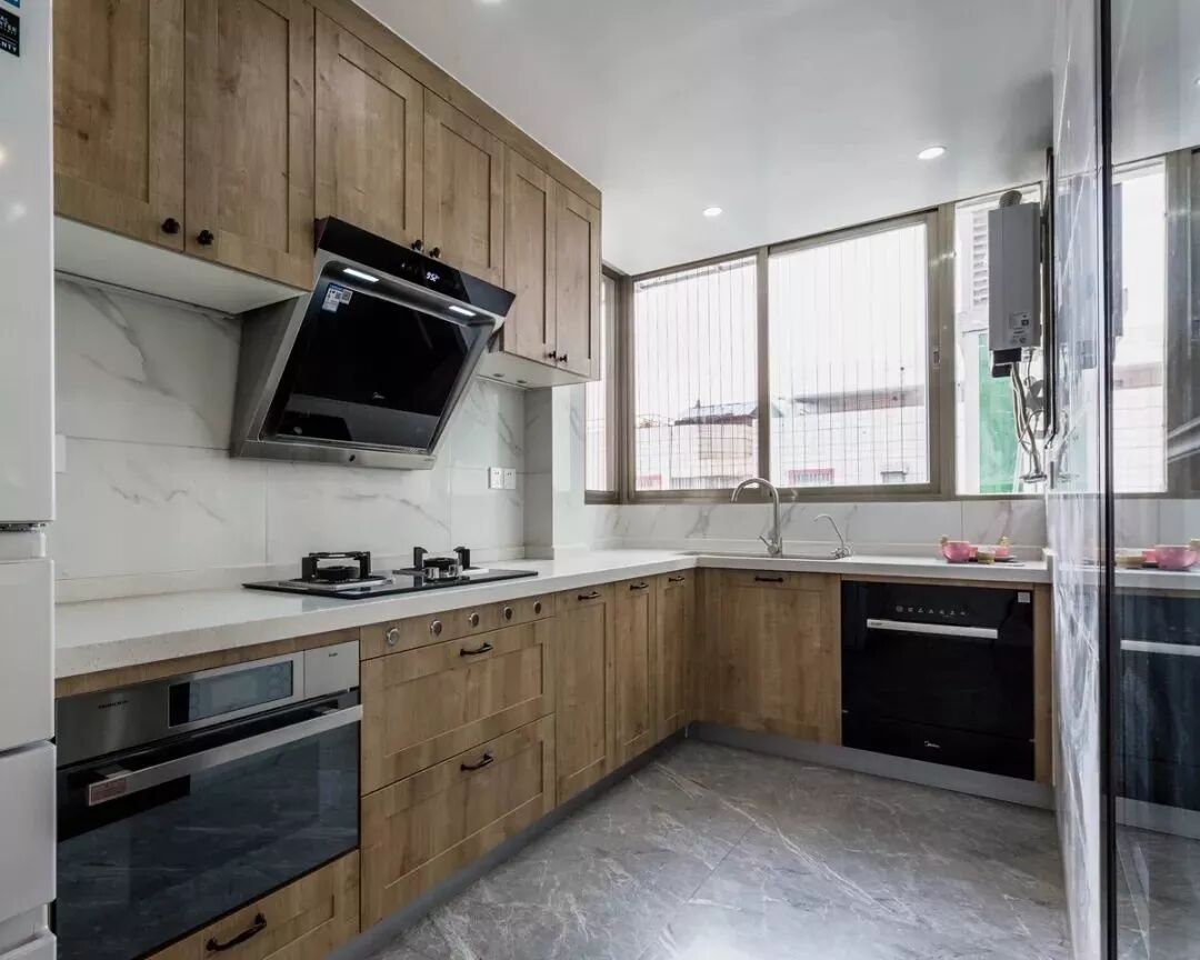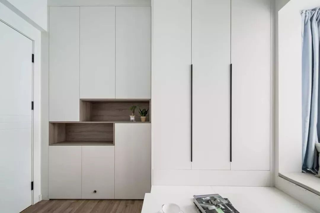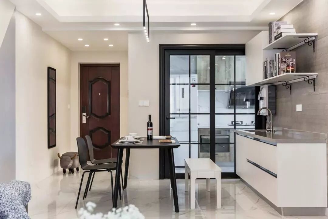 进门玄关利用厨房空间增加嵌入式鞋柜,用于收纳鞋子。一整面的橱柜显然太过死板,所以现在的家装都流行中间留空的设计。