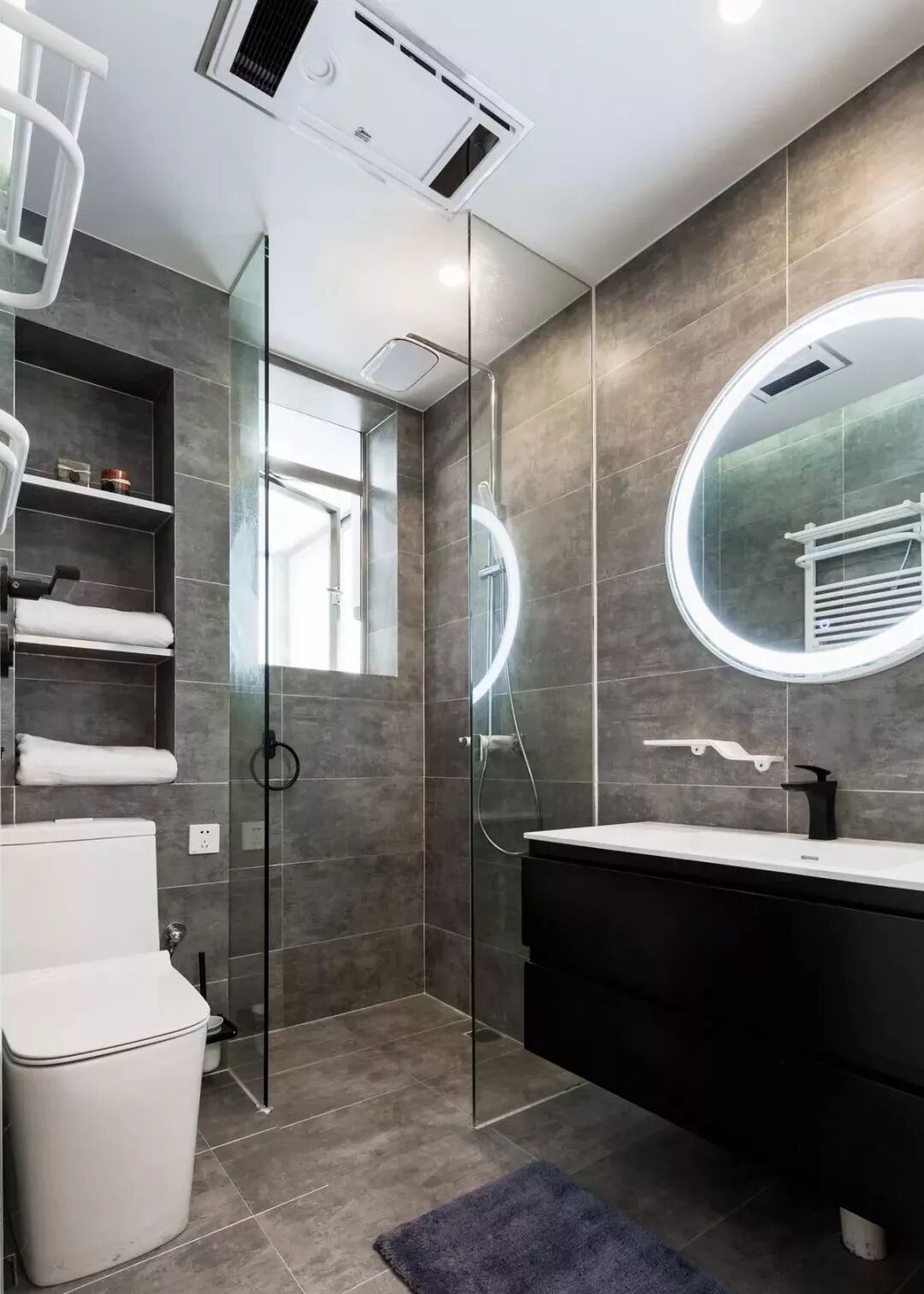 卫生间利用包管位置,做成了壁龛,增加了卫生间的储物功能。淋浴区利用两块到顶透明玻璃,摒弃常规淋浴门,中间地砖采用角度铺设,起到干湿分离的作用。