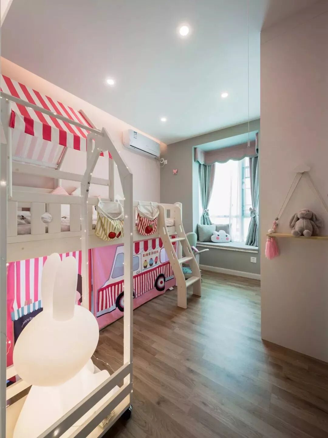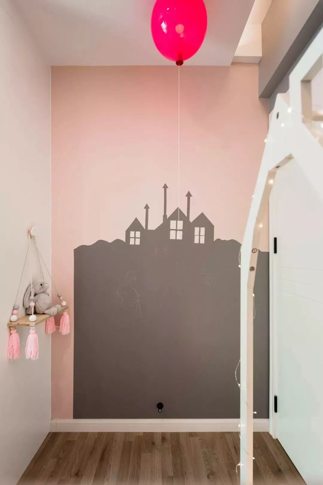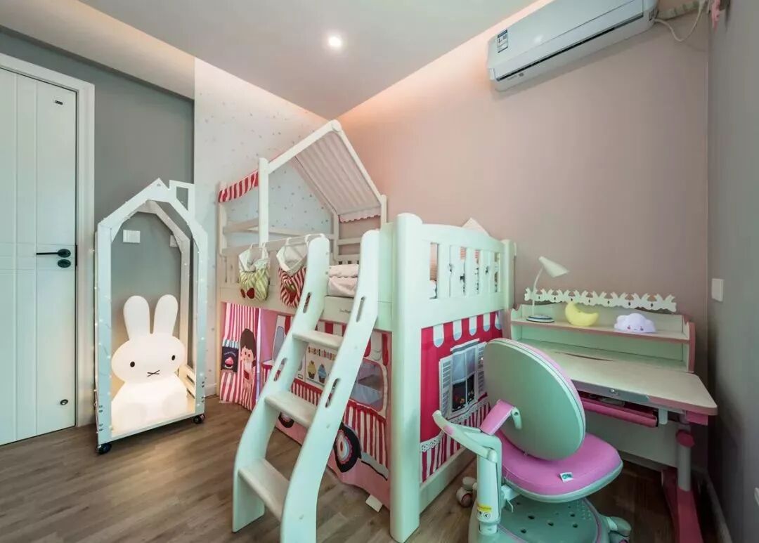 儿童房以粉色和灰色为主色调,主要目的就是要创造出一个梦幻、愉悦的空间。房间的整体布局以玩耍、娱乐、绘画、阅读为主,女儿是一定要惯着的,房间自然也要是最可爱的。