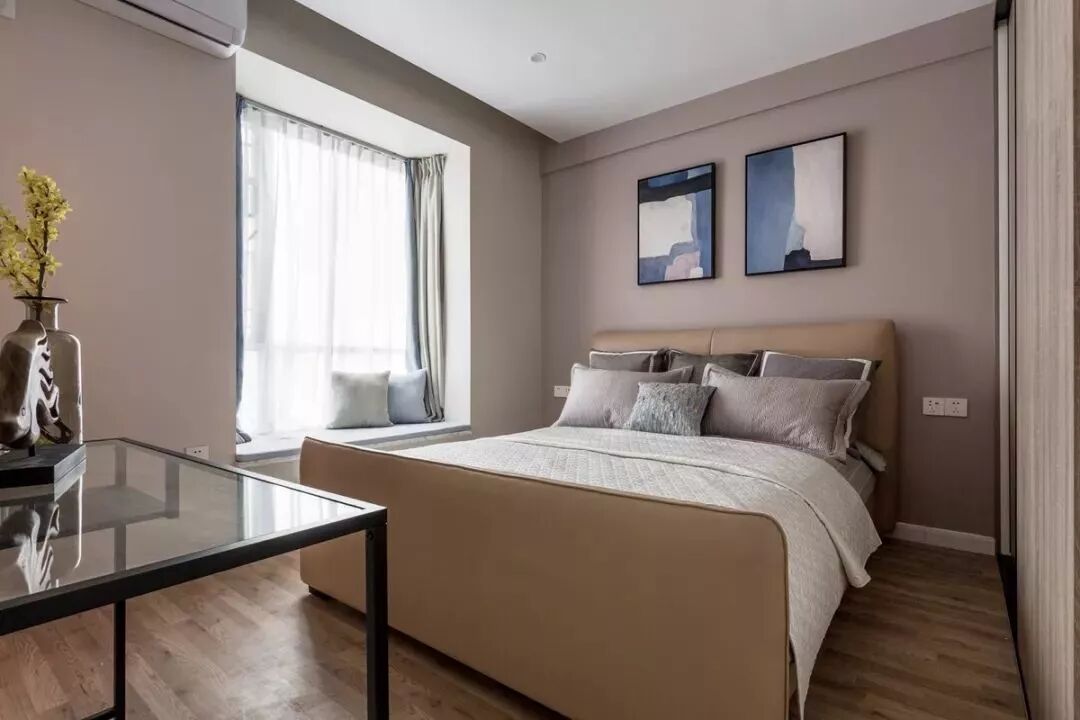 卧室没有设计主灯,使用多个筒灯和灯带作为光源,其筒灯和灯带隐藏于大面积吊顶中。床头没有预留床头柜的位置,在入门处摆放一张正方形的玻璃桌子,兼女主人的梳妆台。