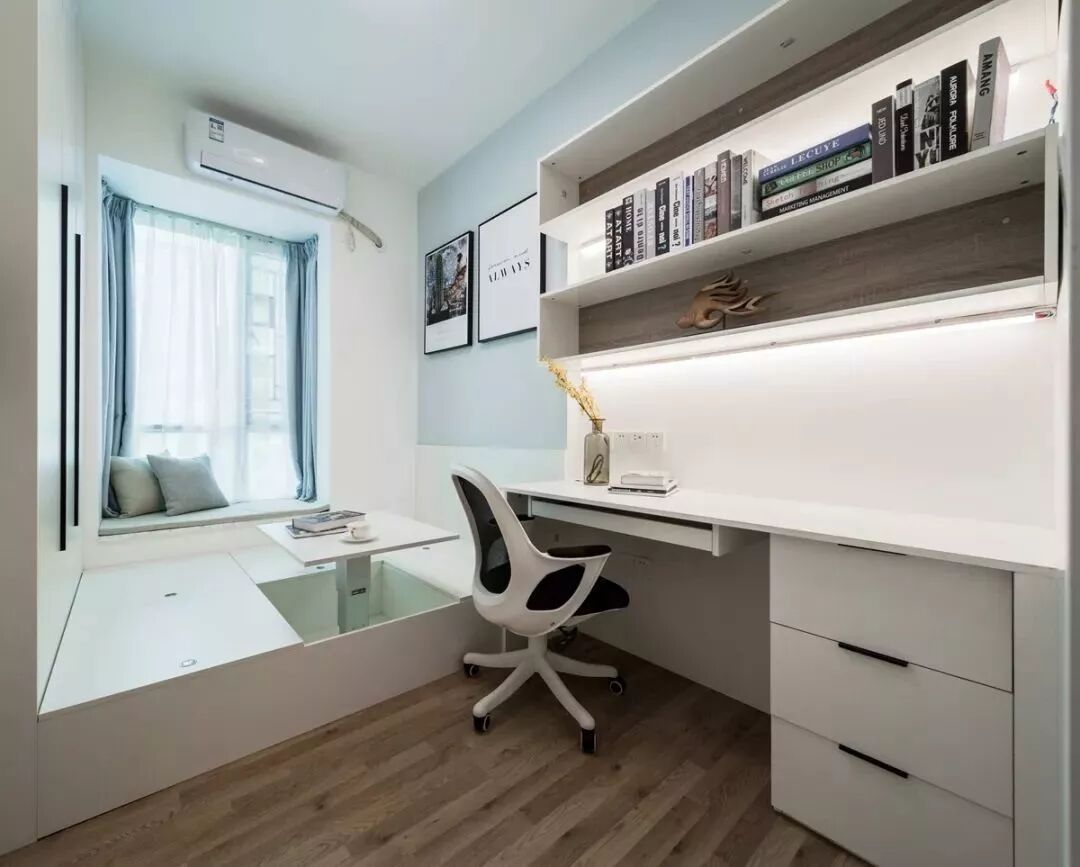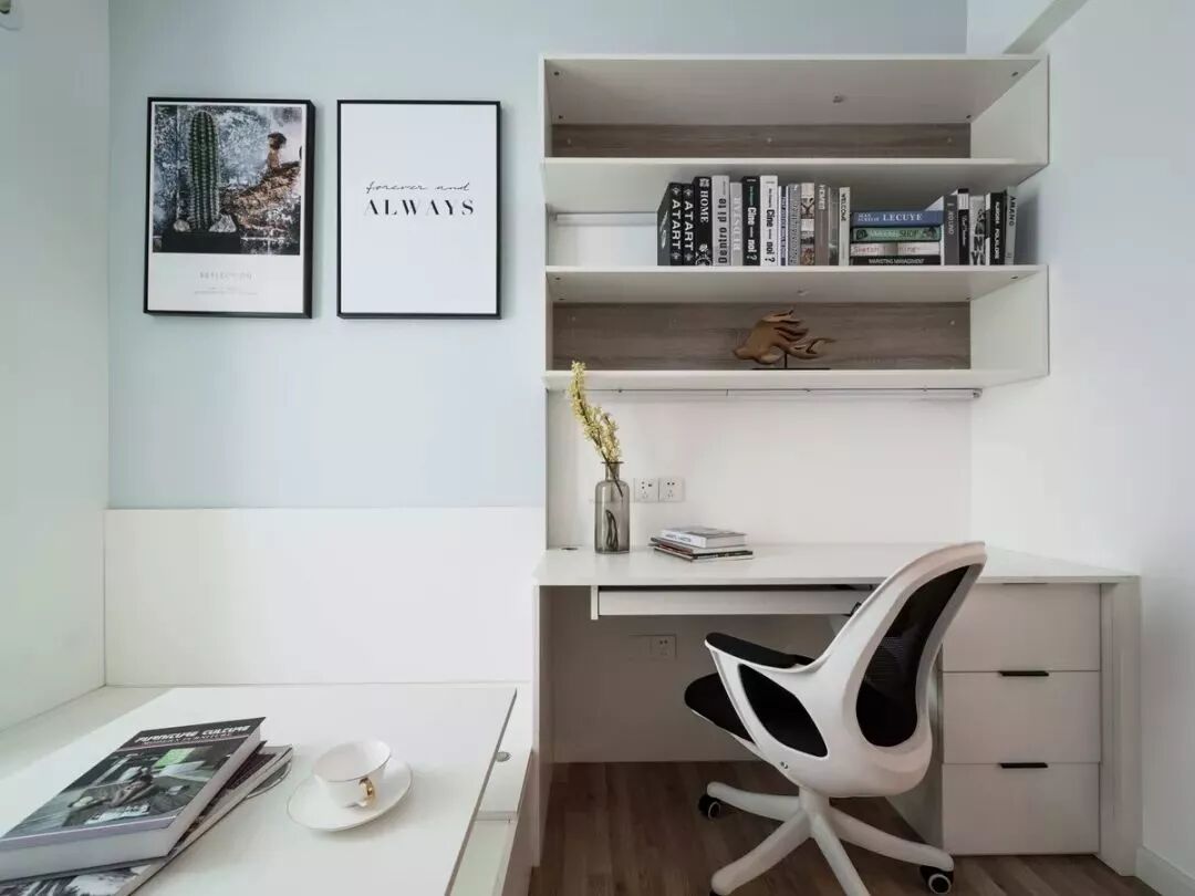 原书房房门和客卫卫生间门相对,考虑风水上面的问题改了房门位置,并在门后边设置了一个大的储物书柜。